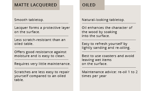 For a wooden table, you can choose between a matte lacquered, oiled, or whitewash finish. The whitewash finish has the same properties as an oiled table. In the overview below, we’ve listed the main differences between a matte lacquered finish and an oiled or whitewash finish.