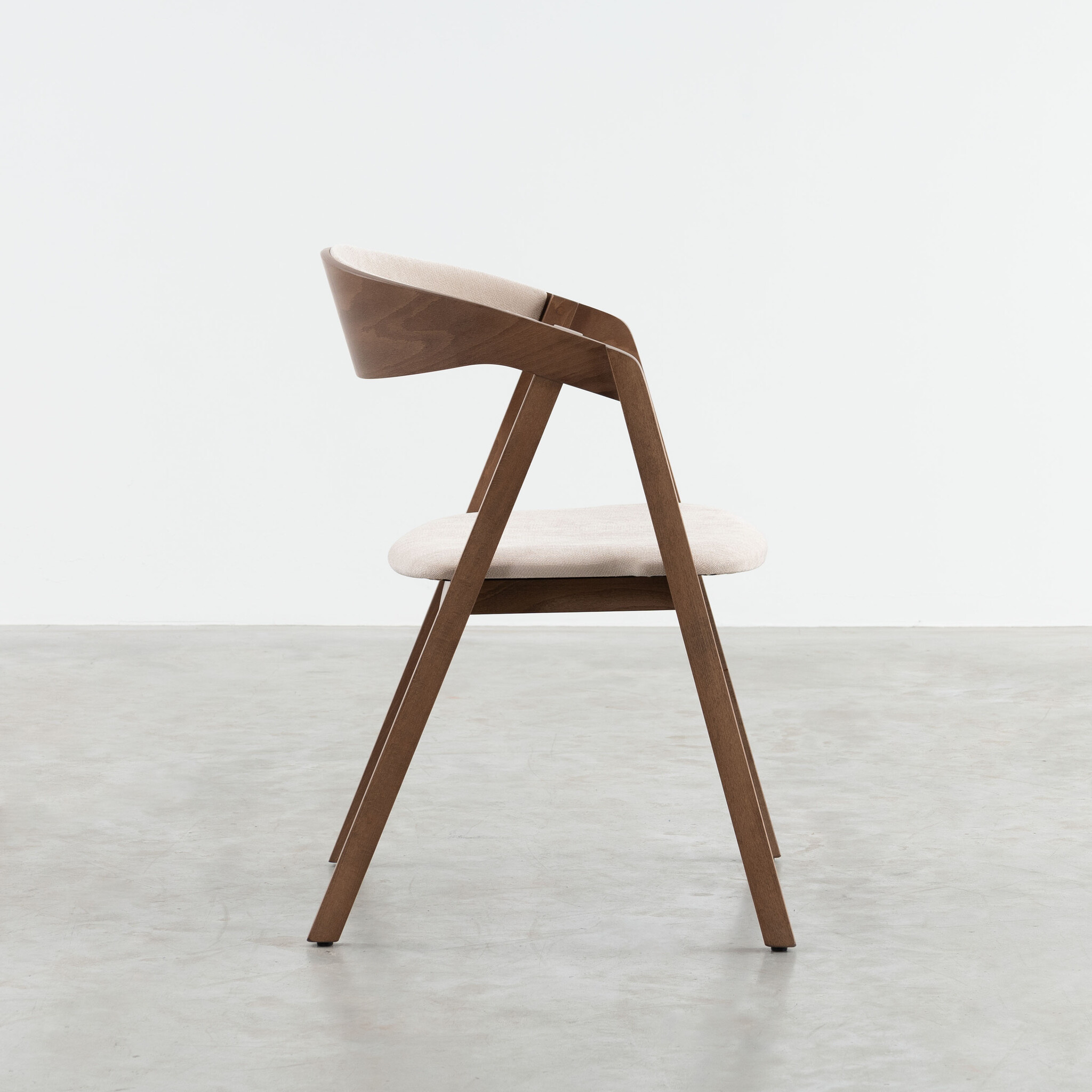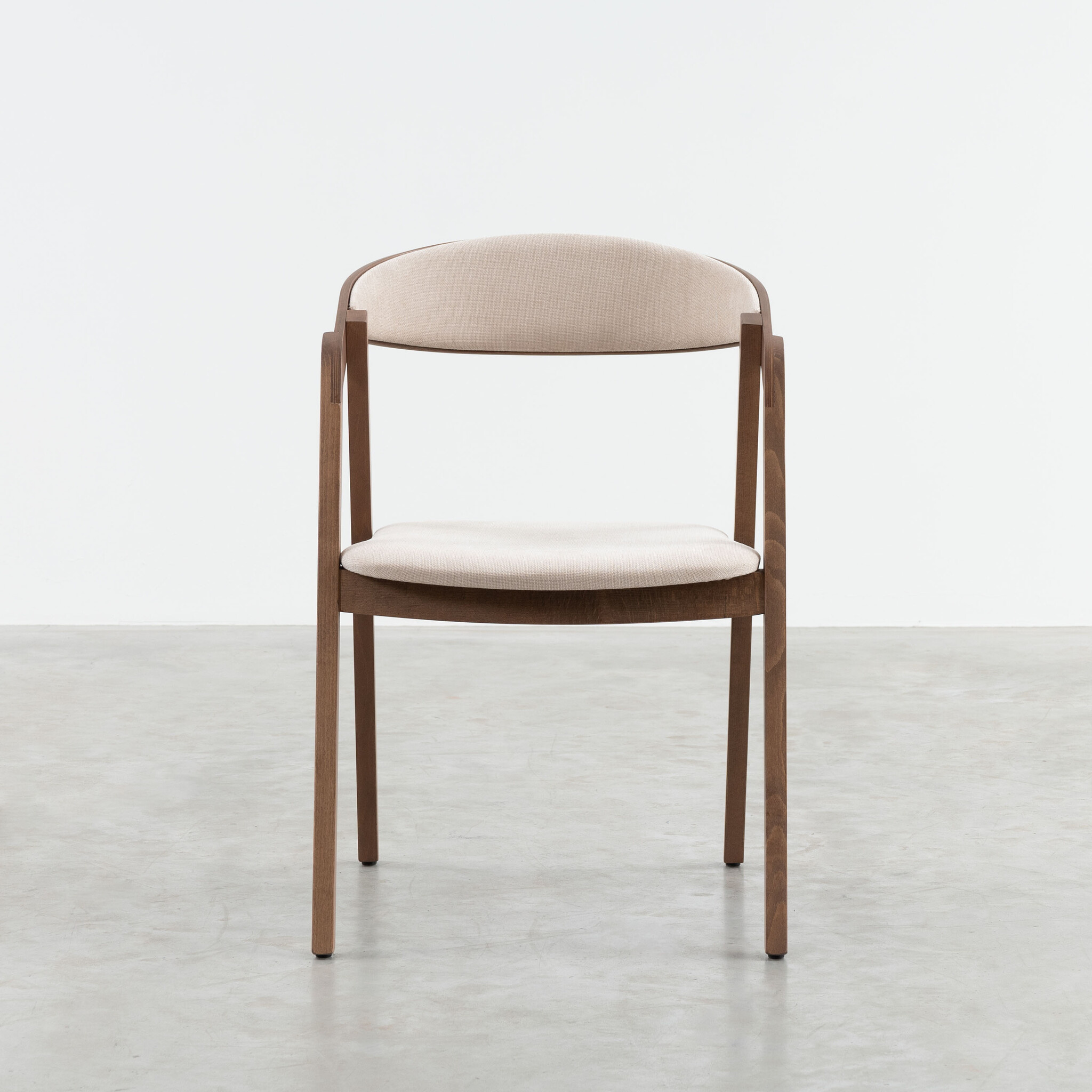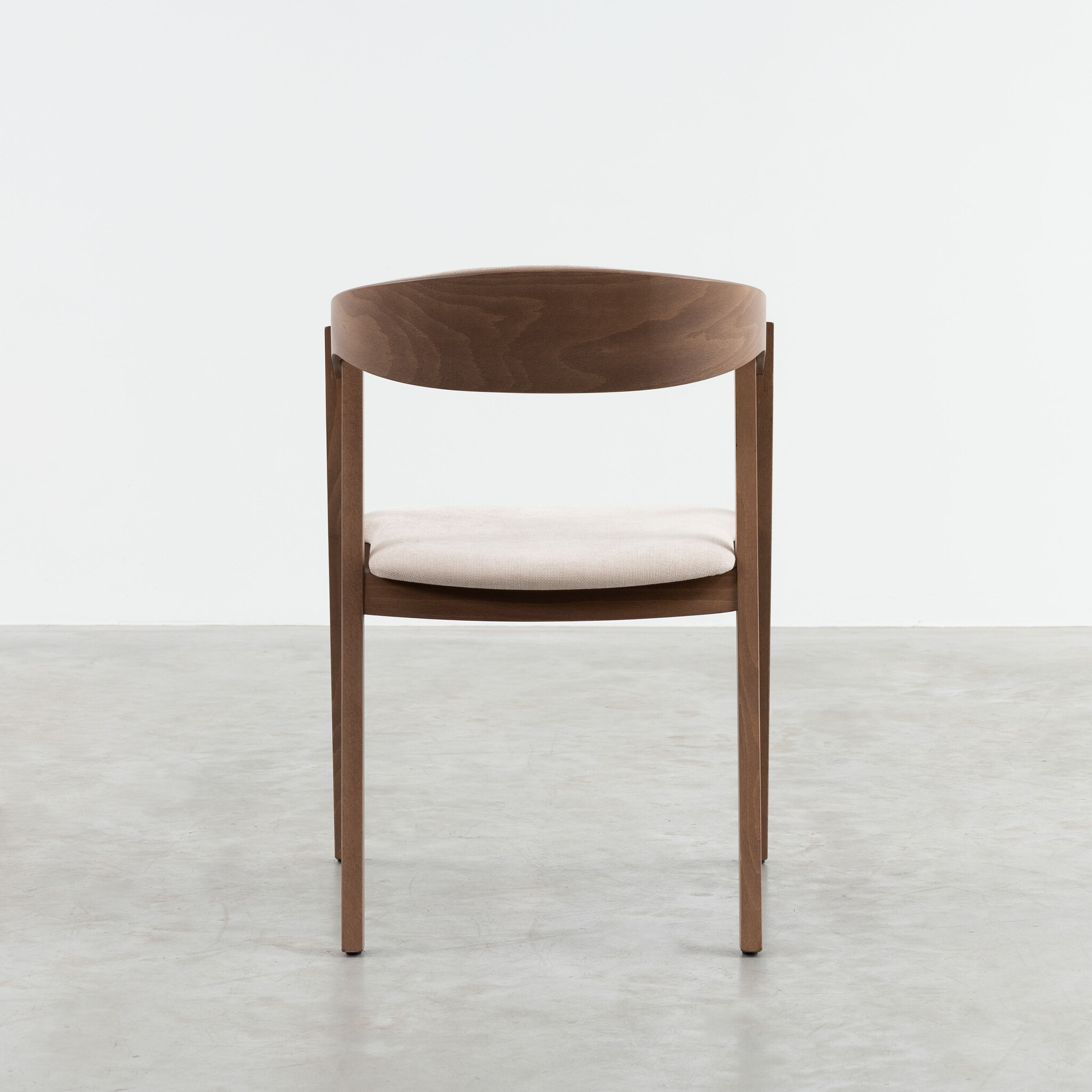 The Edske, with an upholstered back and seat, is available in matte lacquered oak and walnut-colored beech in various Olympus fabric colors.
