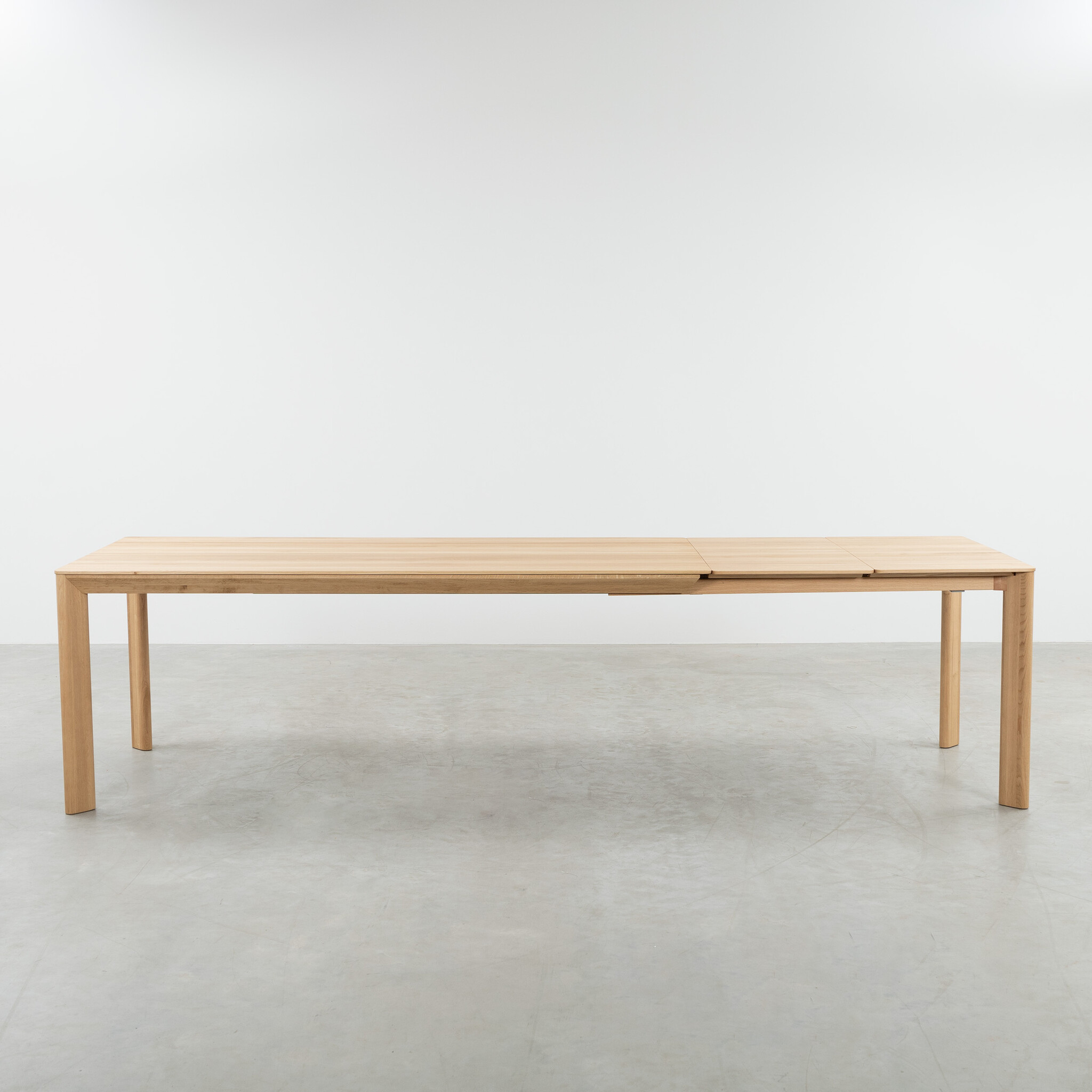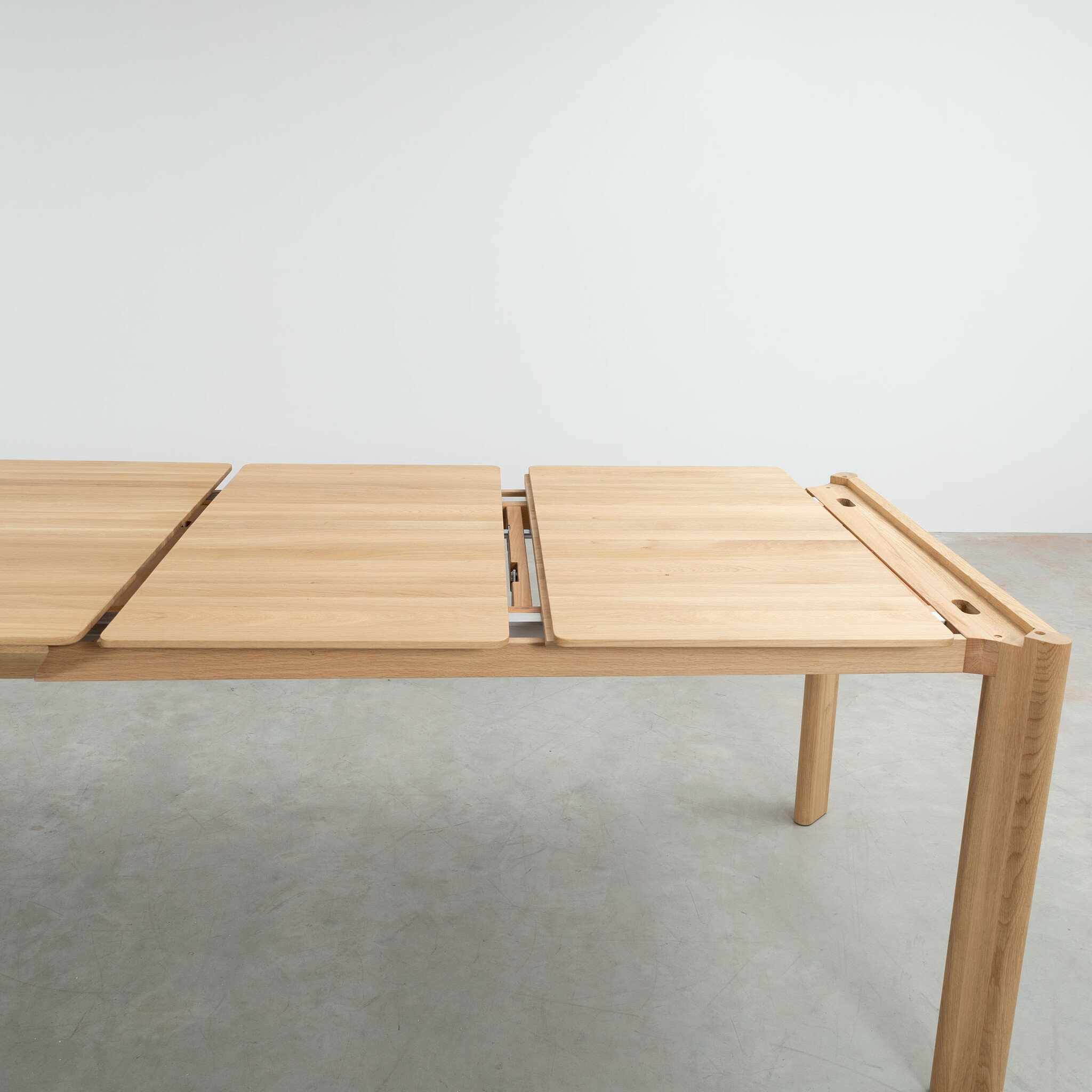 The extension leaves of the extendable Eevi table are stored underneath the tabletop at a slight angle. In a solid wood version, the grain pattern does not continue in the extended section, adding to the natural charm of the wood. Visit one of our showrooms to see the extendable Eevi table in person and discuss the available options with us.