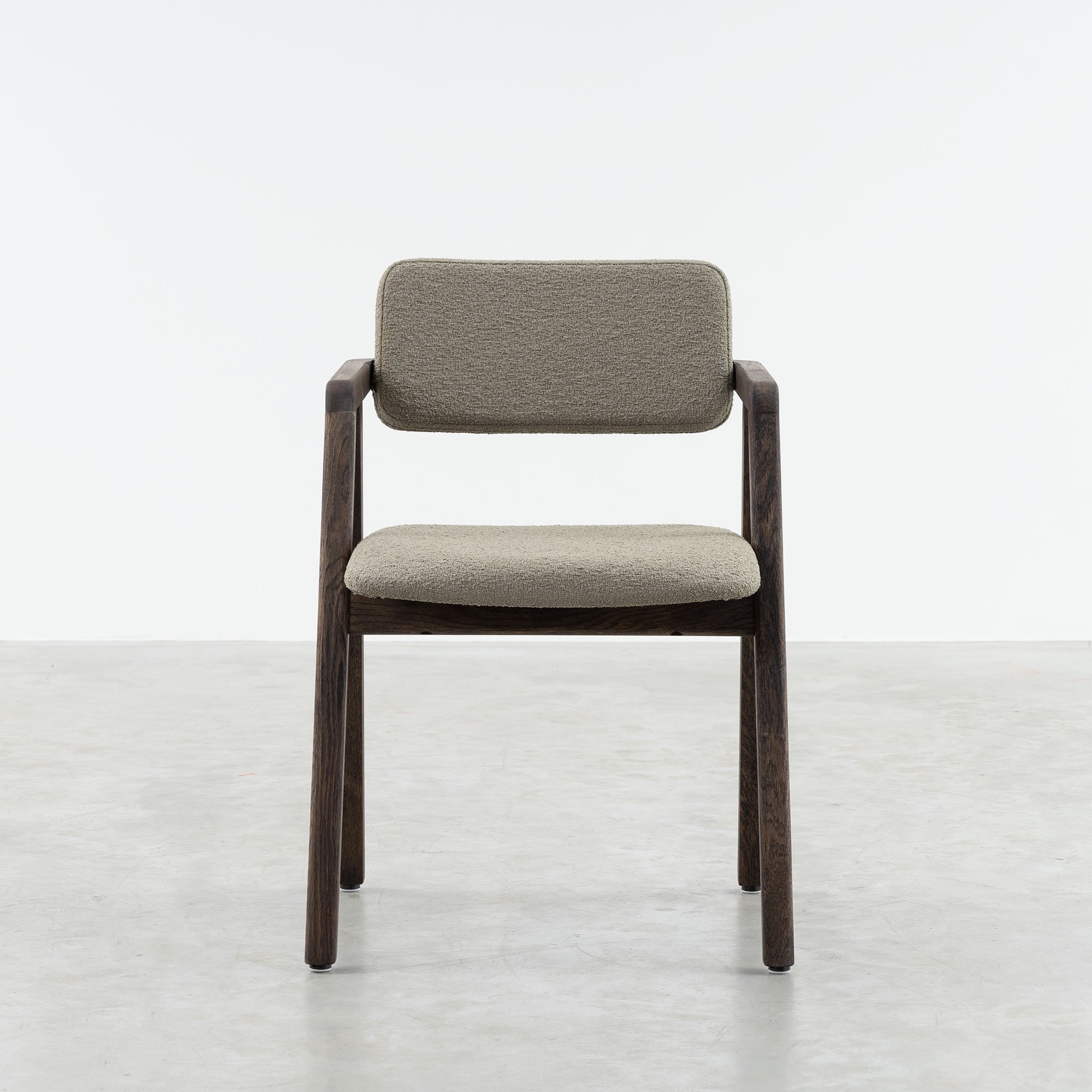 Enya's backrest almost seems like it could float away, but is simply firmly anchored to continuous armrests. This dining chair has an oak frame with a smoked oiled finish. Enya has an upholstered seat and backrest, available in different fabric types and colours.