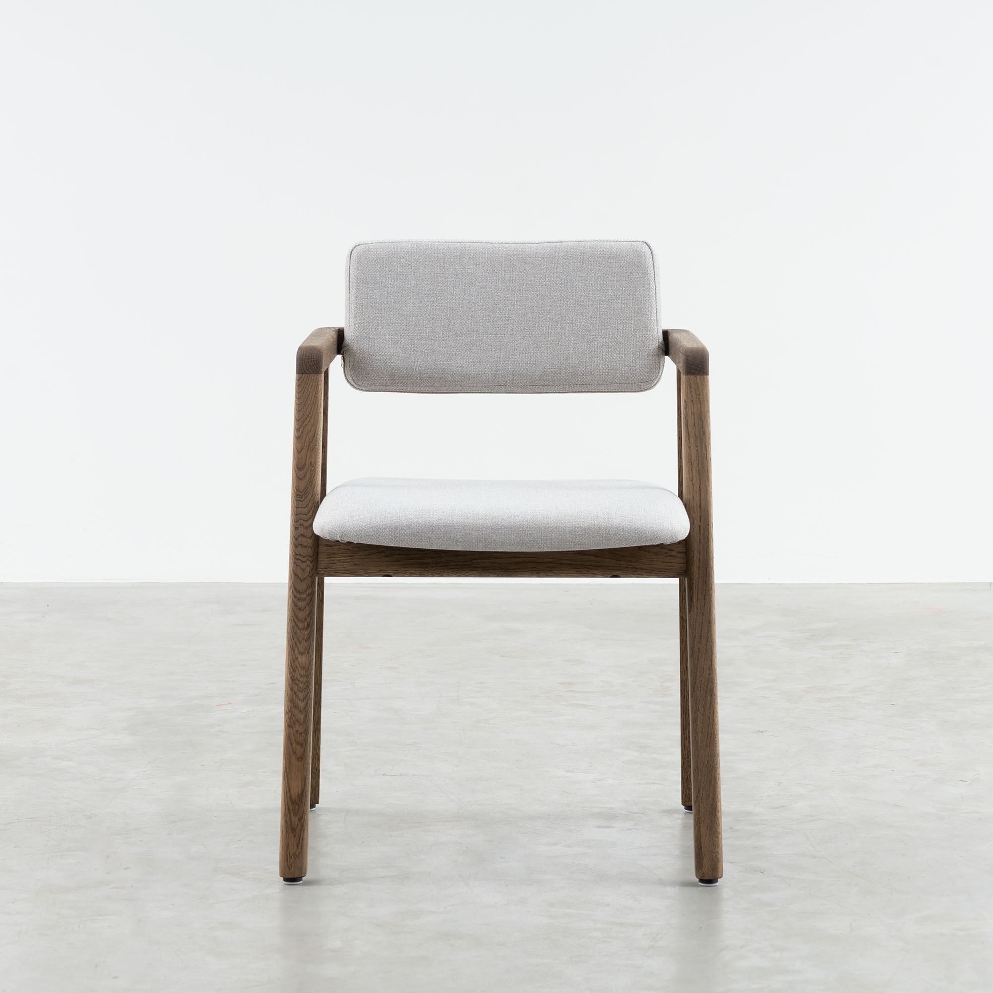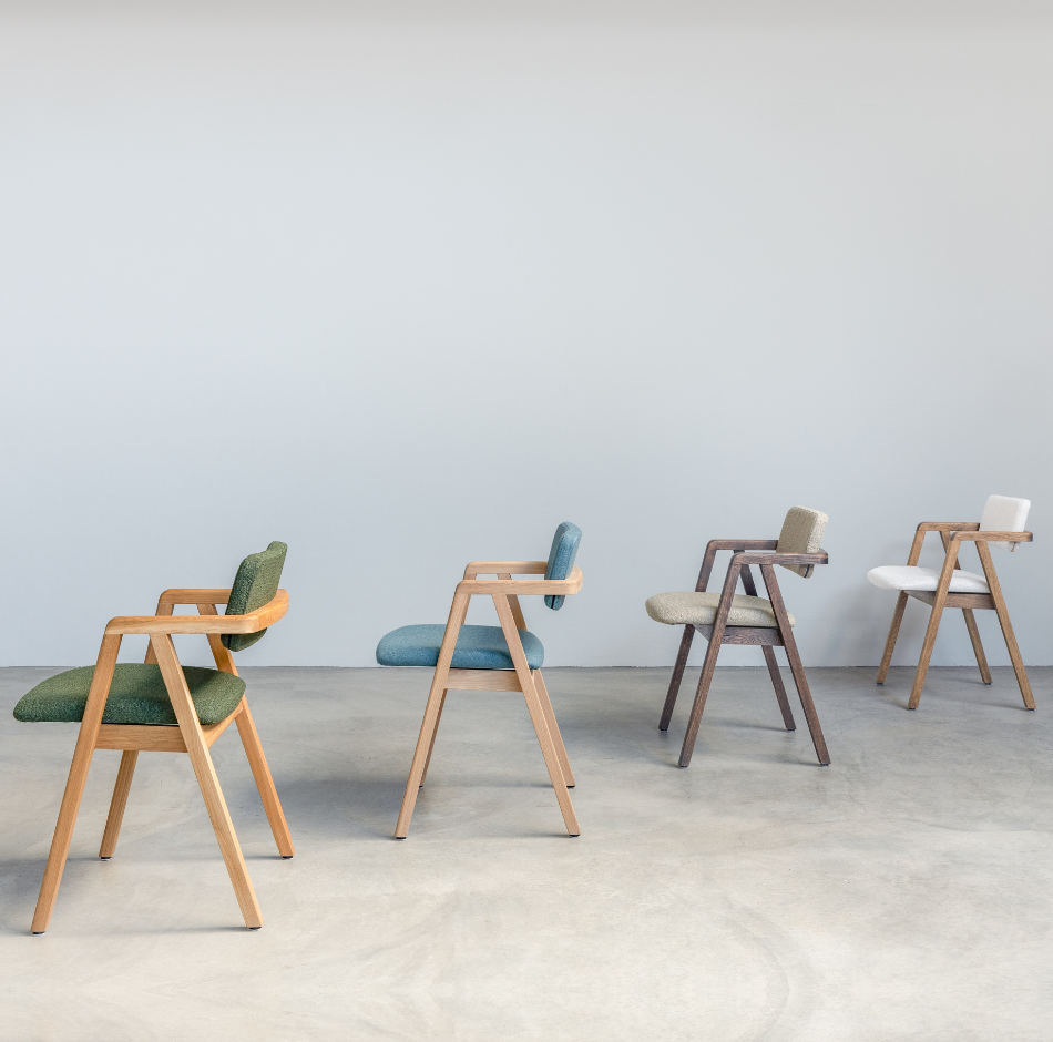 Enya's backrest almost seems like it could float away, but is simply firmly anchored to continuous armrests. This dining chair has a frame made of oak wood with a mocca oiled finish. Enya has an upholstered seat and backrest, available in different fabric types and colours.