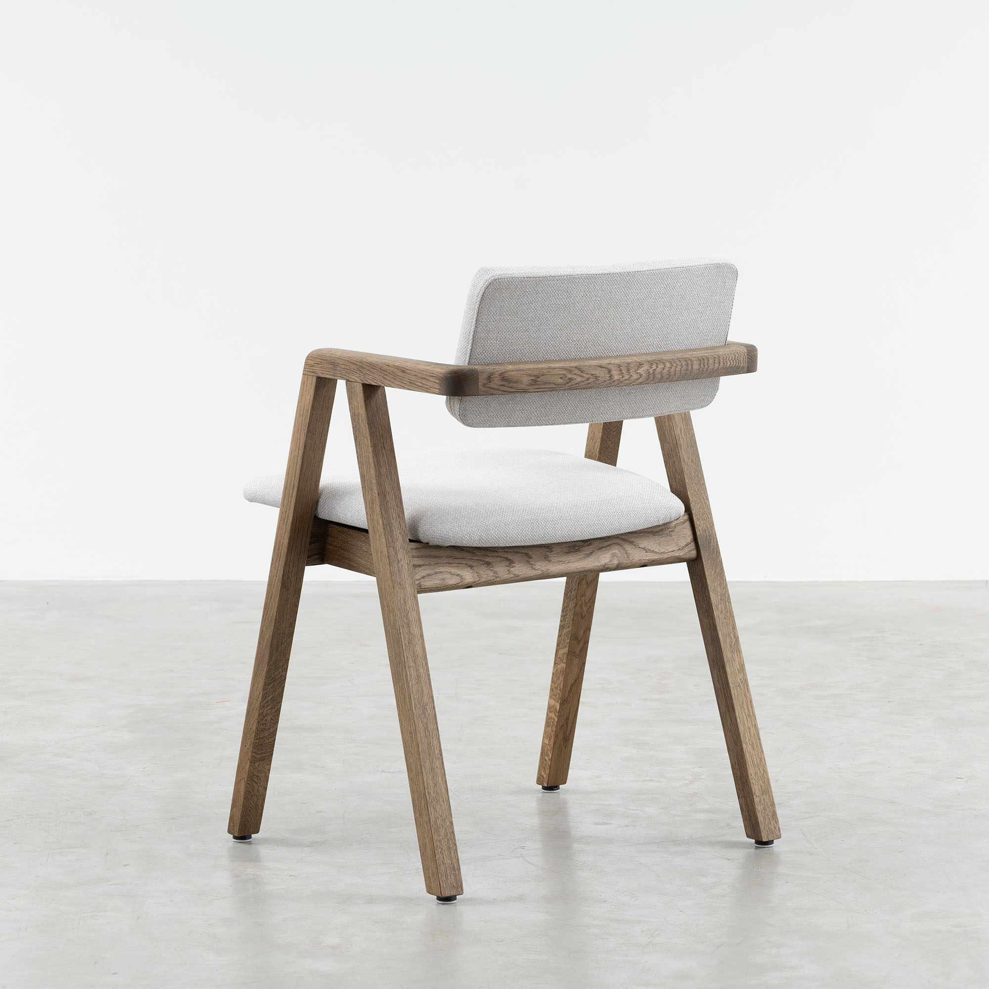 Enya's backrest almost seems like it could float away, but is simply firmly anchored to continuous armrests. This dining chair has a frame made of oak wood with a mocca oiled finish. Enya has an upholstered seat and backrest, available in different fabric types and colours.