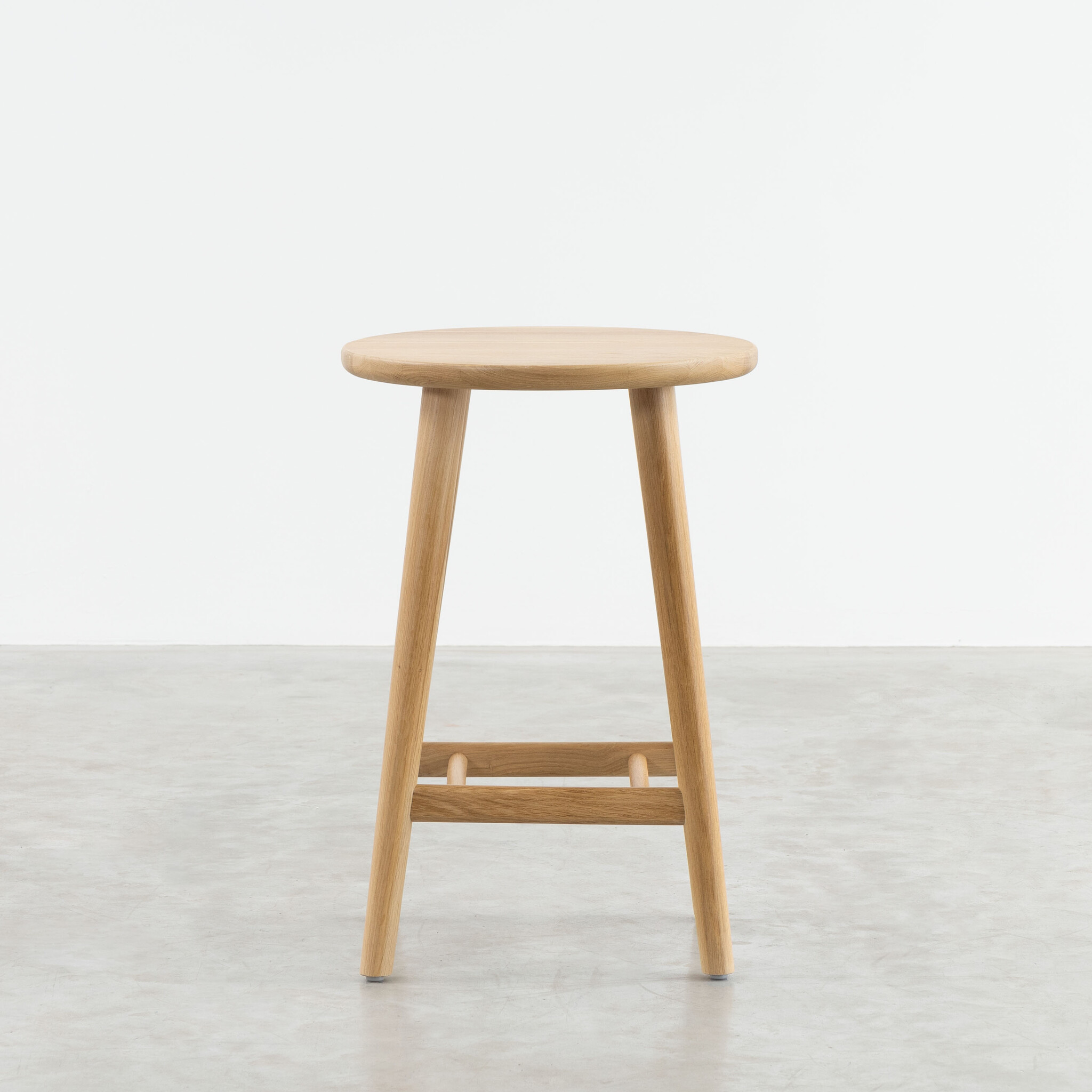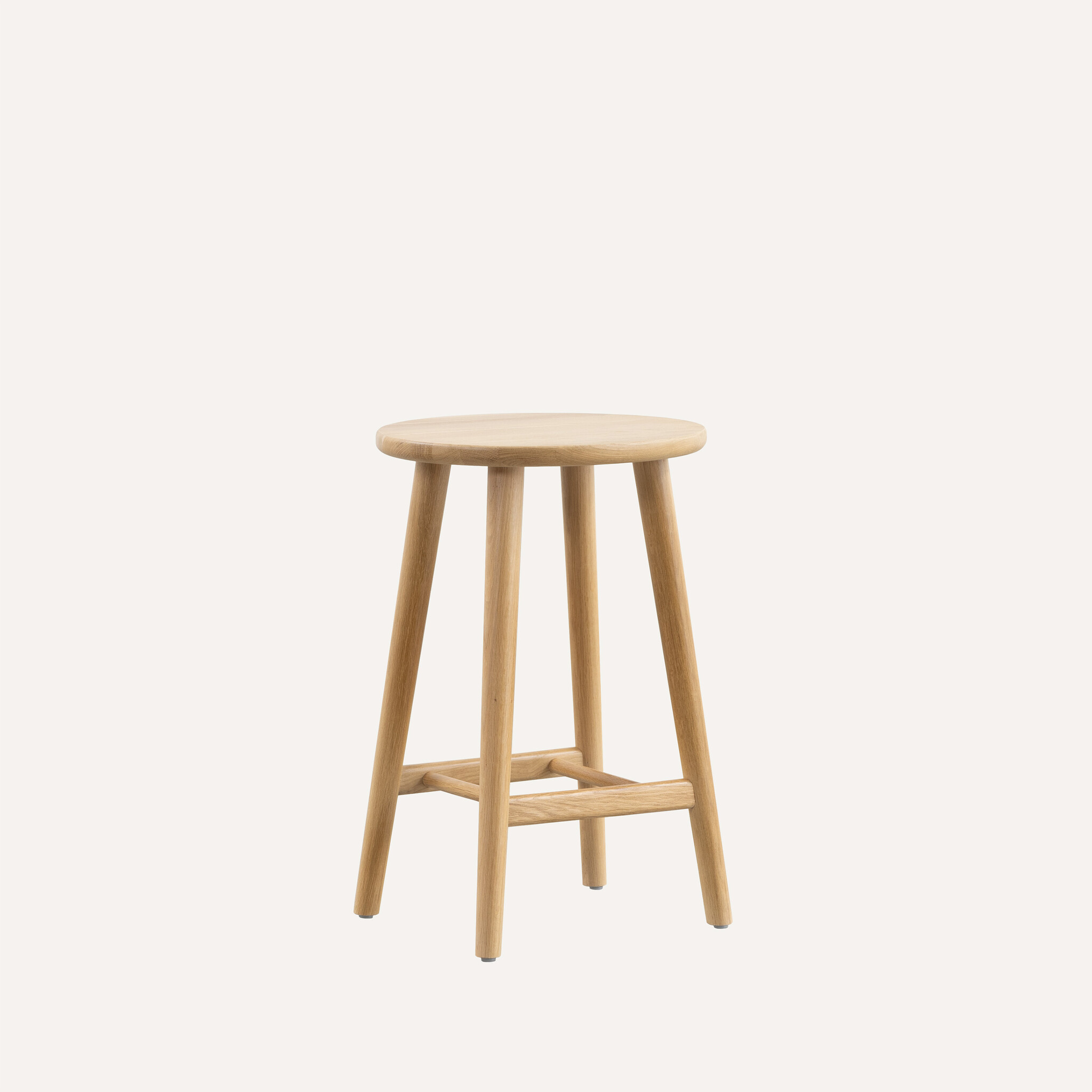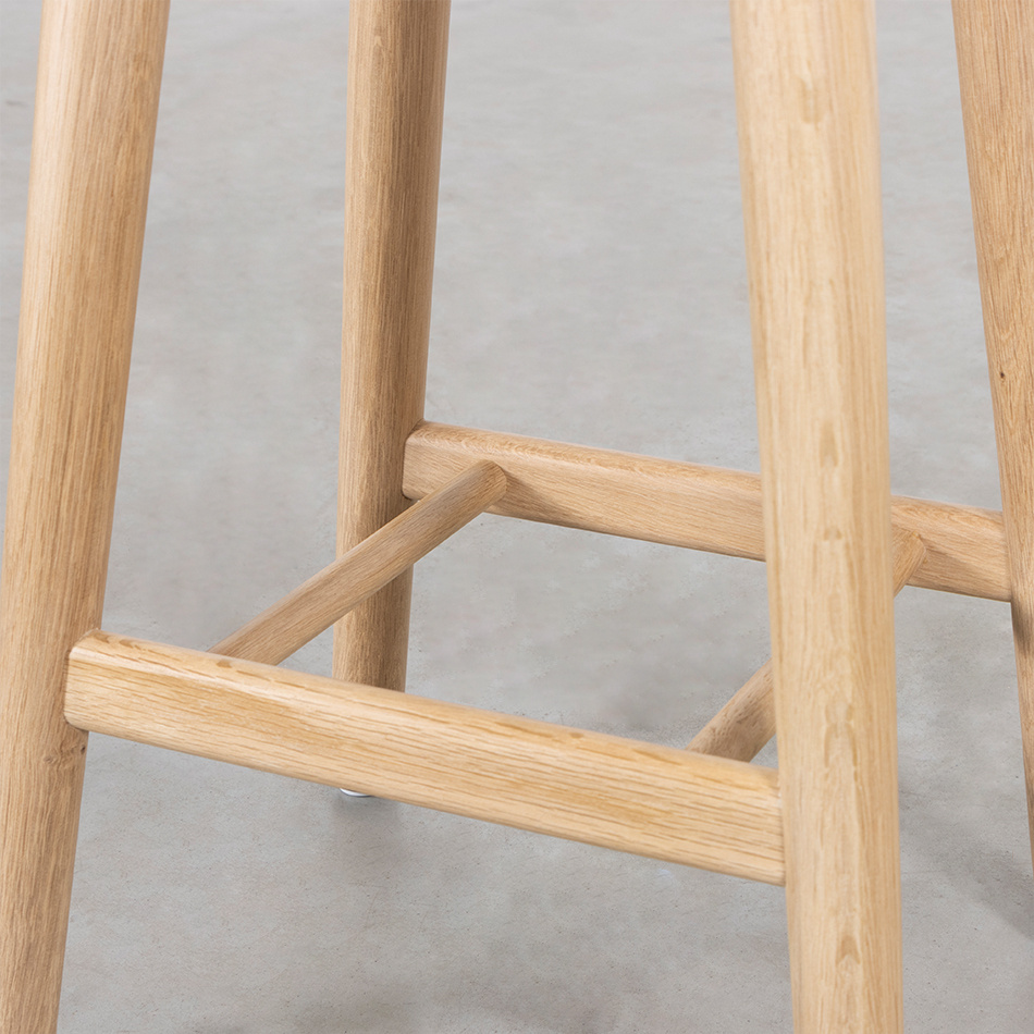 This sleek design counter bar stool is made of solid oak. The stool has a matte lacquered finish. Sturdy and with a height of 66 cm, ideal for a kitchen island. For the bar or standing table there is the Fjerre Bar Stool, with a seat height of 75 cm. The slightly oval seat has dimensions of 40x45 cm.