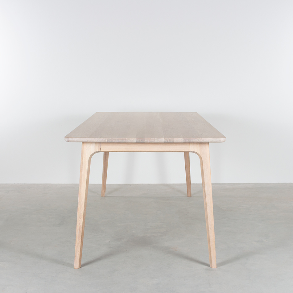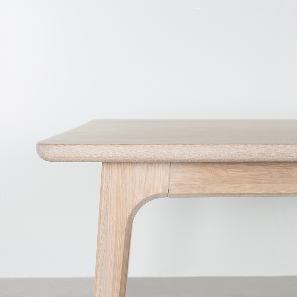 Shape down to the last detail, that is characteristic of the Fjerre. The table-top has a round corner finish and the sides also have a smooth round finish. The top of the table-top is flat. Much attention has been paid to the shape of the table legs. It is not immediately noticeable, but whoever pays attention will notice that it consists of a pentagon. The transition to the bottom edge is also beautiful and forms 1 whole.