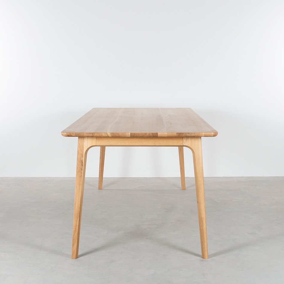 Shape down to the last detail, that is characteristic of the Fjerre. The table-top has a round corner finish and the sides also have a smooth round finish. The top of the table-top is flat. Much attention has been paid to the shape of the table legs. It is not immediately noticeable, but whoever pays attention will notice that it consists of a pentagon. The transition to the bottom edge is also beautiful and forms 1 whole.