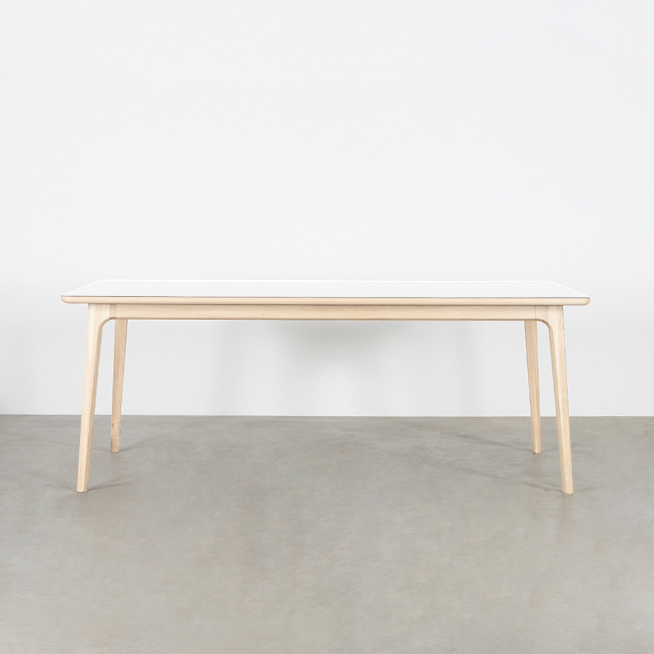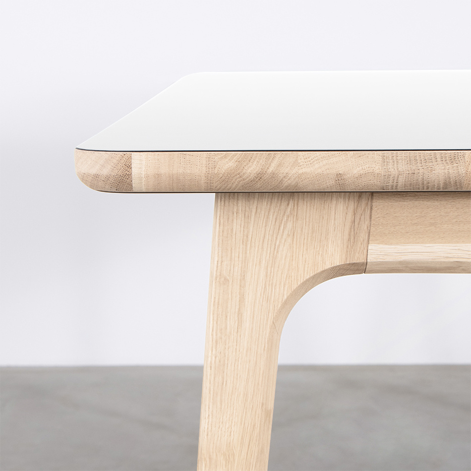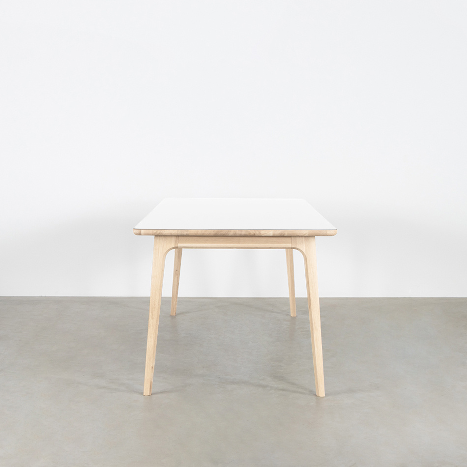 Shape down to the last detail, that is characteristic of the Fjerre. The table-top has a round corner finish and the sides also have a smooth round finish. The top of the table-top is flat. Much attention has been paid to the shape of the table legs. It is not immediately noticeable, but whoever pays attention will notice that it consists of a pentagon. The transition to the bottom edge is also beautiful and forms 1 whole.