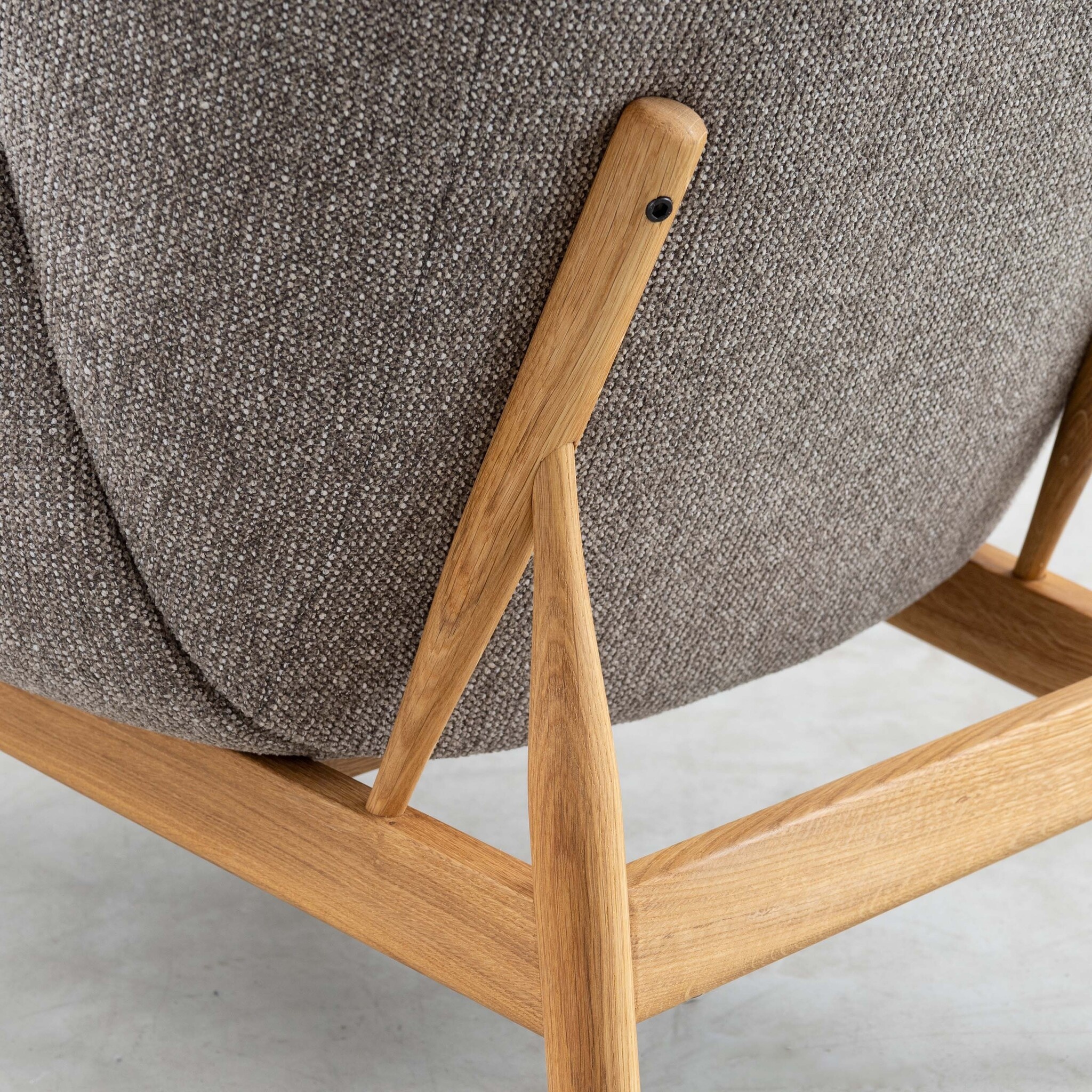 Freddi comes with an oak frame and cushions in Matino fabric, available as standard in four stylish colours that blend effortlessly into any interior. Prefer a different fabric? Use the configuration option. First, choose the frame finish: matt or black lacquered. Then, select one of the premium fabrics, each available in multiple colours. This way, you can customise your ideal Freddi armchair – entirely to your own taste.