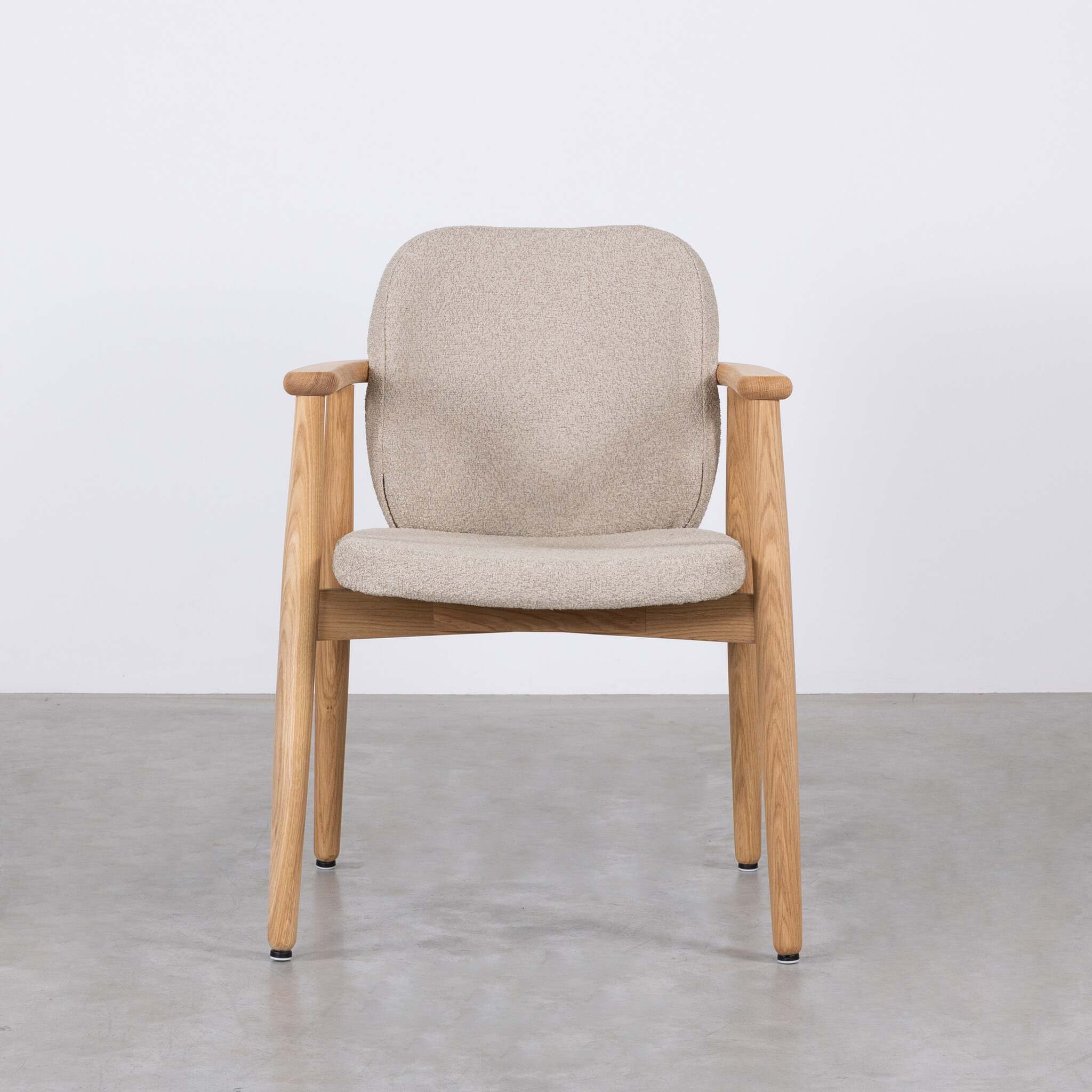The dining chair Kaisa stands out with its refined details and well-balanced proportions. The rounded armrests and seamless transition to the backrest give the chair a smooth and elegant look. The solid oak frame is carefully finished with oil, emphasizing the natural beauty of the wood. Kaisa is a sturdy chair that offers ample seating comfort thanks to its upholstered seat and backrest. The upholstery is available in various types of fabric and colors, allowing you to choose what best suits your interior style.