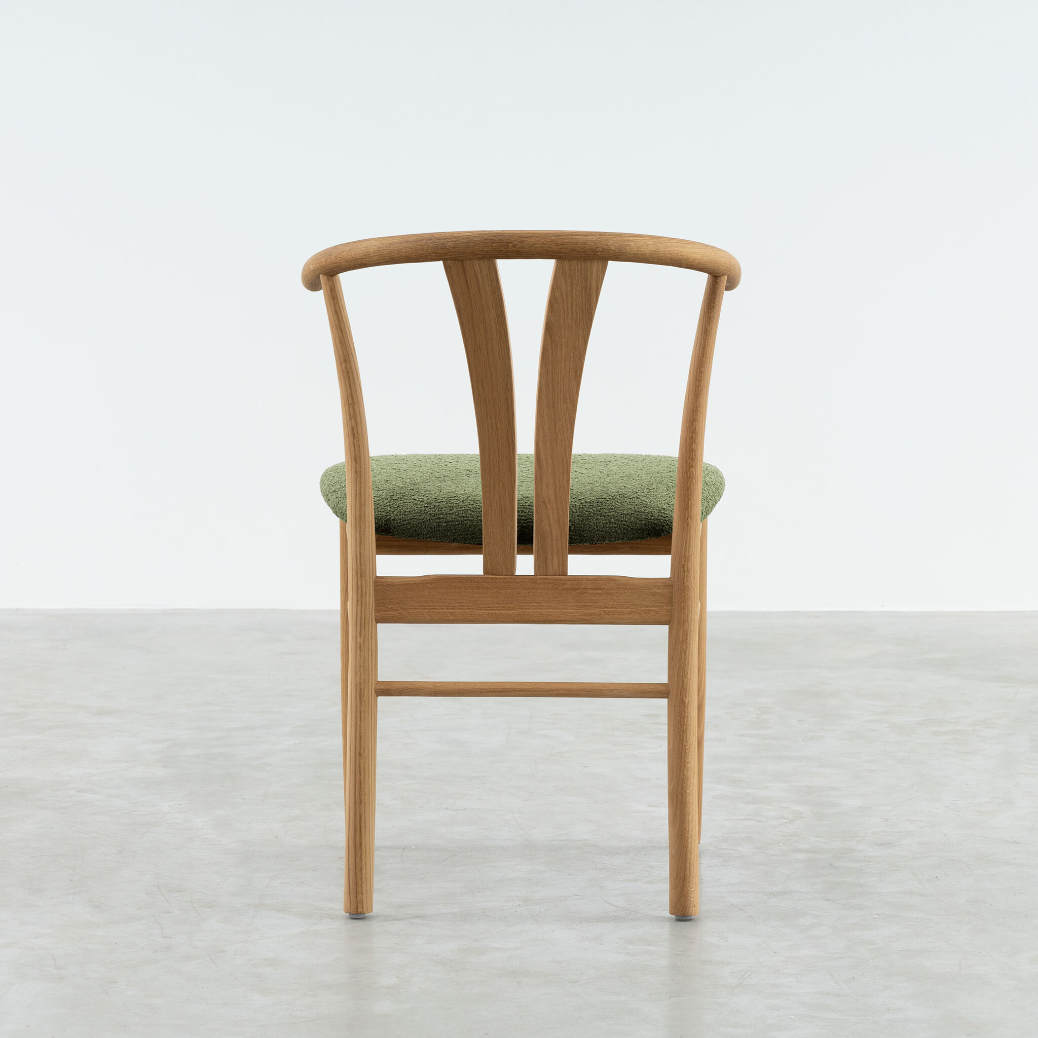 Chair Miias shows that the beloved combination of oak wood and textile never gets old. The oak wood is finished with a natural oil and the seat upholstery is available in four colors.