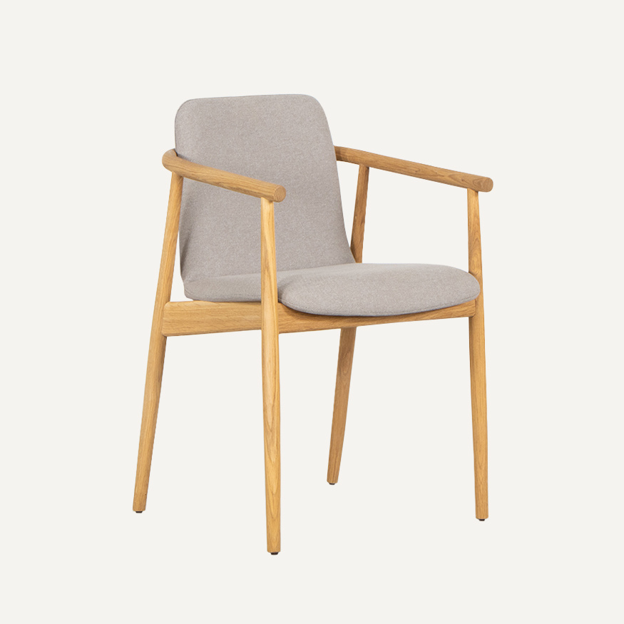 The wooden seat and back from one flowing wooden whole, which is supported by the frame. The frame is a special combination of curved and straight lines. A combination that looks strong and elegant and a joy to sit on. The Mirja is made of solid oak wood. The wood is finished with oil. The chair is available with a wooden or upholstered seat.