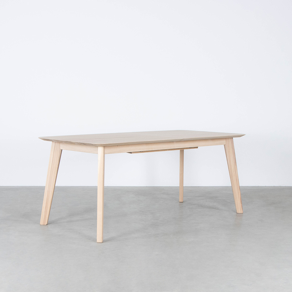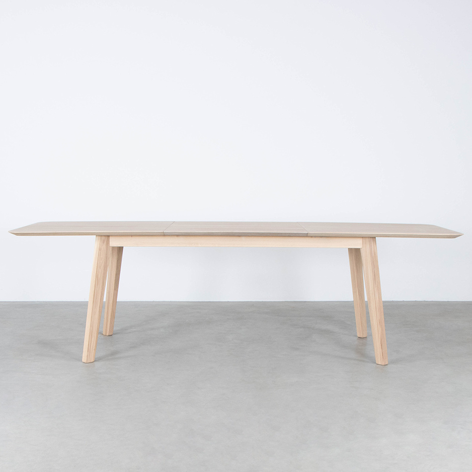 In addition to the round Nonne, there is now also the straight extendable variant. The Nonne table is a modern extendable table with a light and playful character. The table-top has a rejuvenation on the underside of the top and a flat top. An extra leaf of 60 or 80 centimeters can be inserted from the middle of the top. The four legs of the Nonne table are angled and have rounded corners. It is a dining table that looks light, but stands strong on its legs. Everything on the table is smoothly finished. When extending, the legs remain in place.
