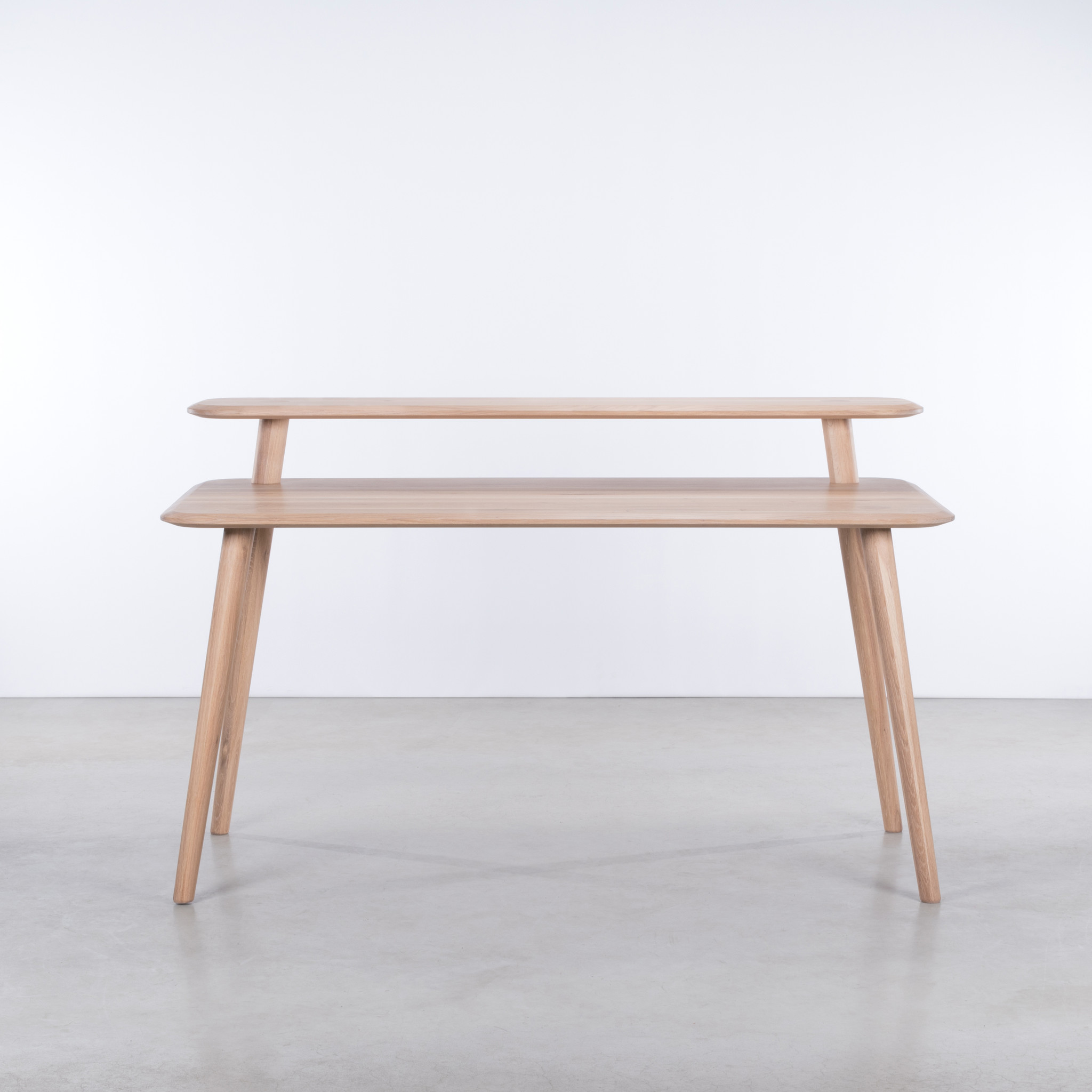 Very slender desk table with special details. The most eye-catching detail are the legs that extend into the top. The table legs protrude through the top, as it were, where they have a nice flat finish. An absolutely high-quality design feature and beautifully executed. The legs are round and slightly angled. The desk can be described as modern Danish design. Other beautiful details are the thin, tapered top with rounded corners and the plateau on which, for example, a screen can be placed at the perfect height.