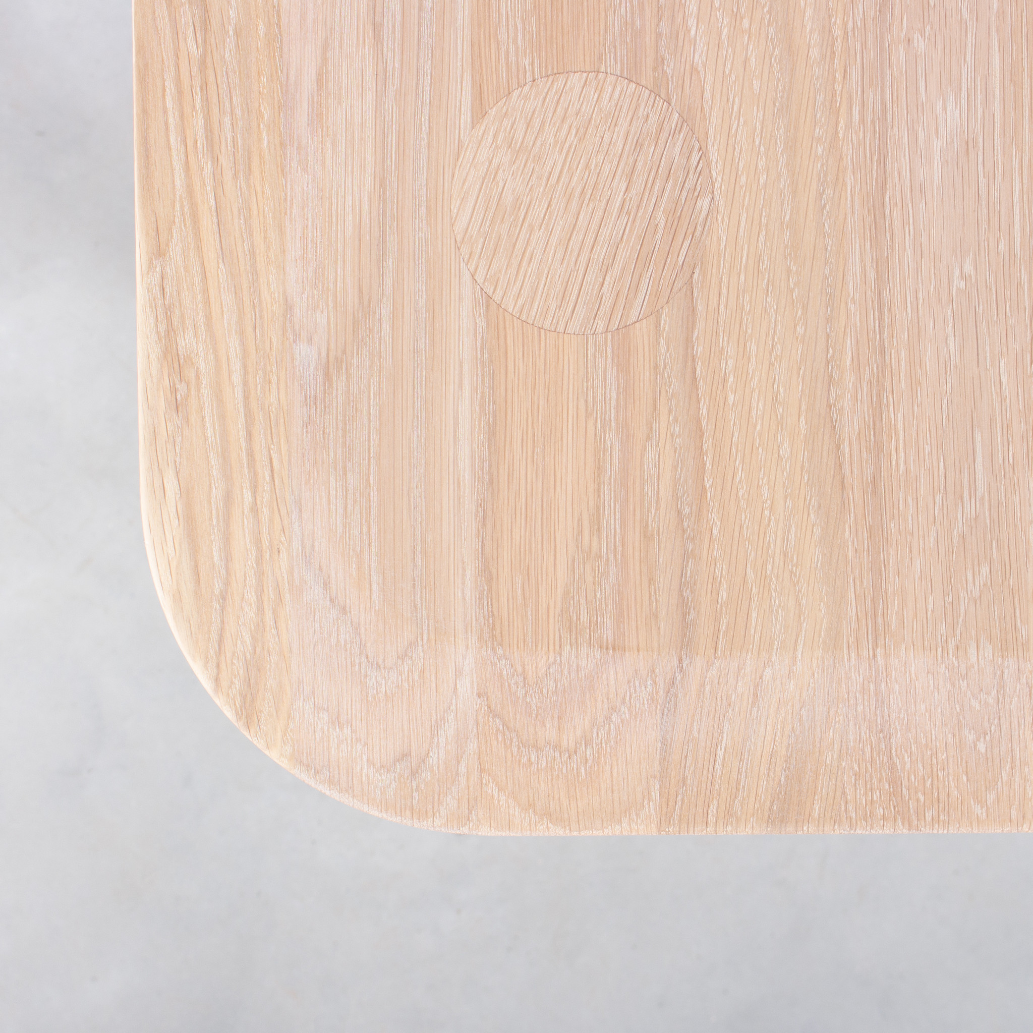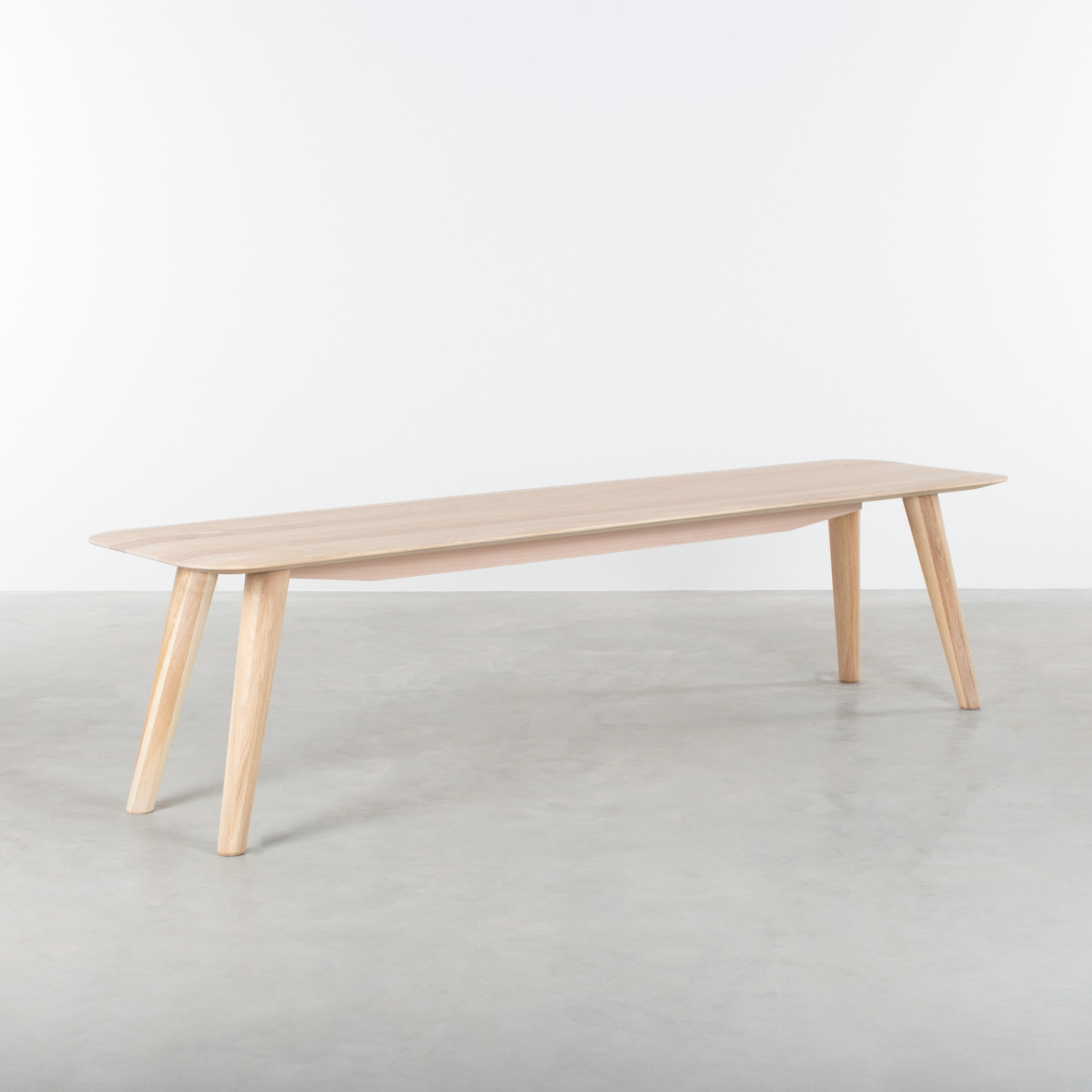 The Olger dining table bench is made of solid wood and has a slender shape and round corners. The dining table bench has the same design as the Olger dining table. Together they form a perfect duo. The most striking detail are the legs that extend into the top. The legs protrude, as it were, through the top and, just like the top, have a nice flat finish. Special to see and beautifully executed.