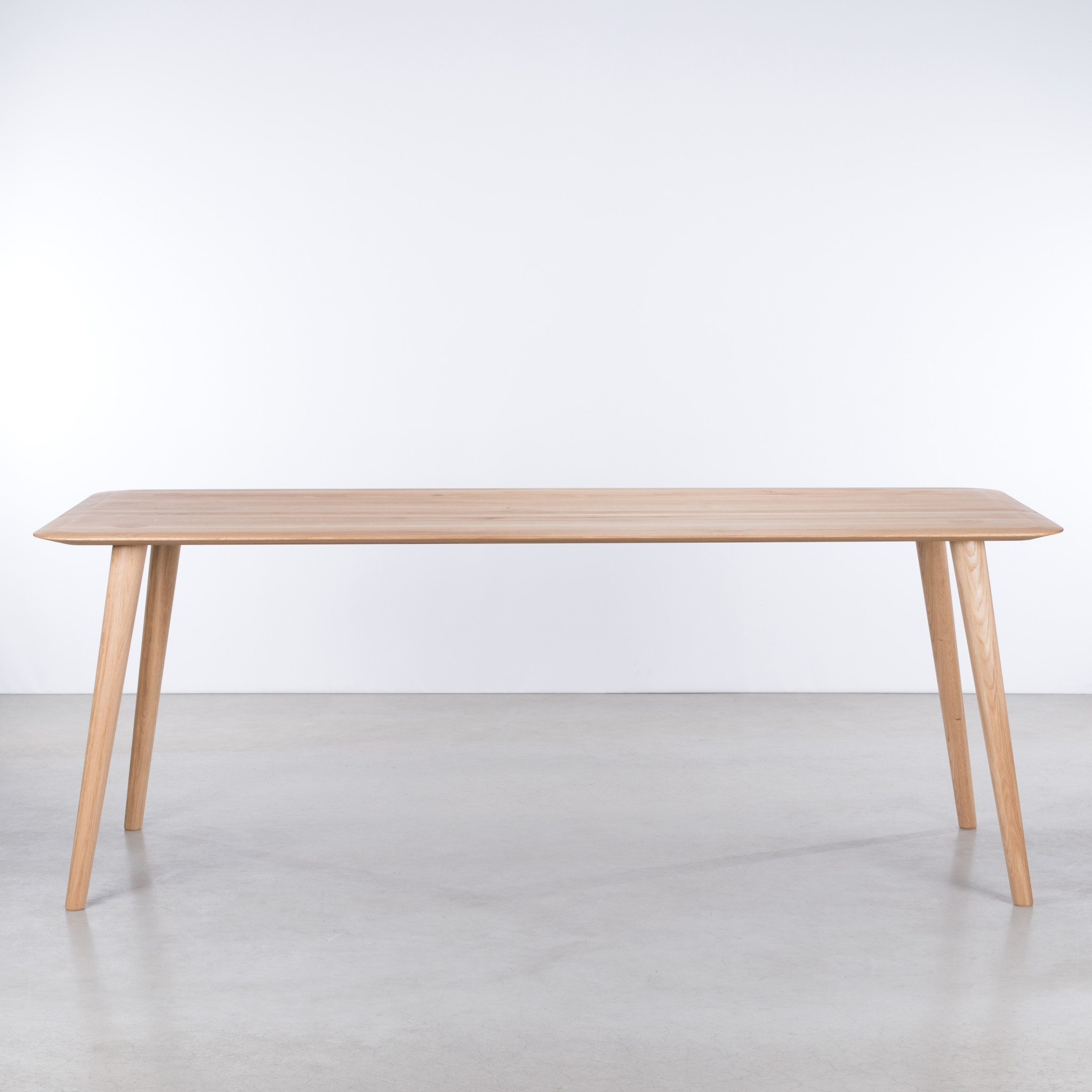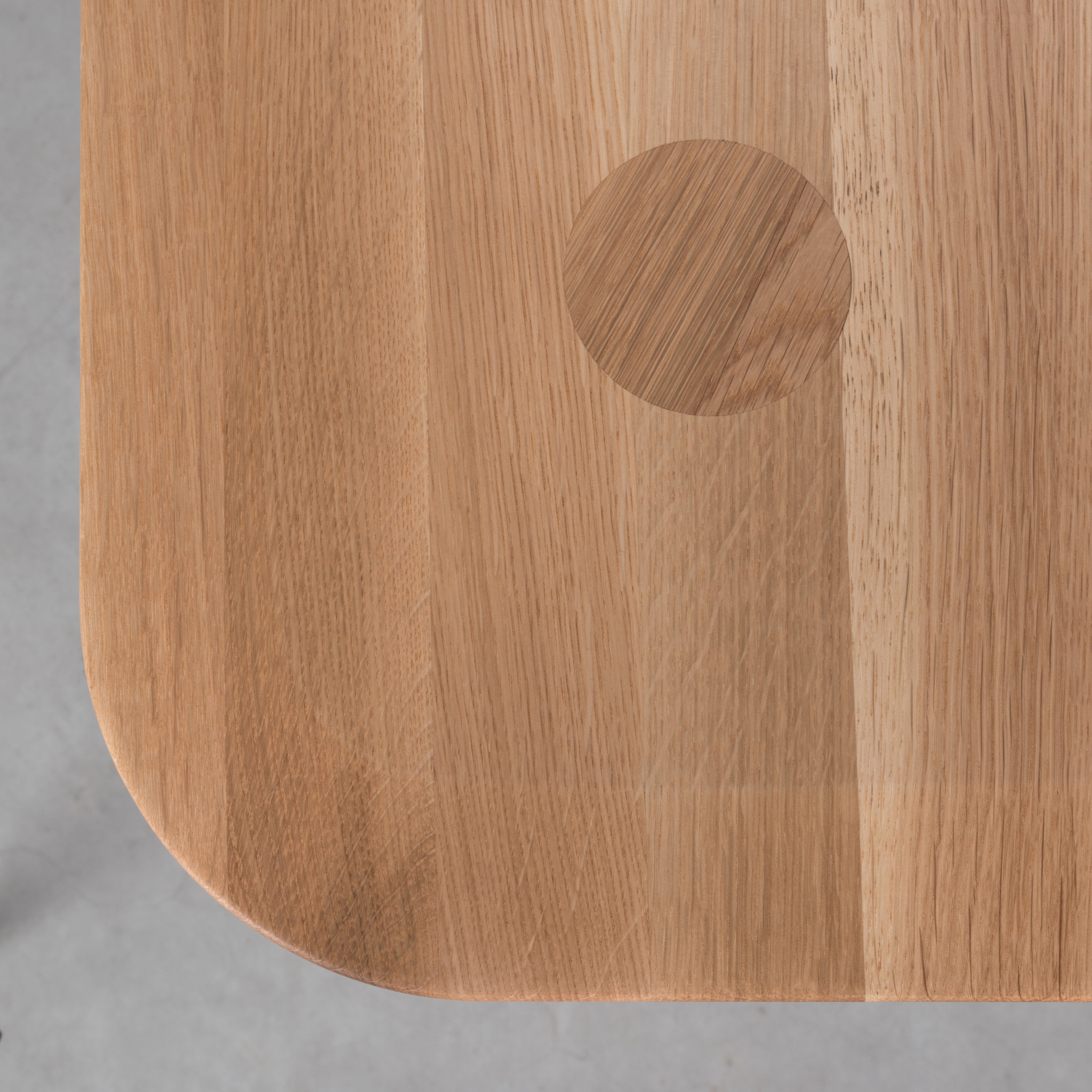 The Olger has a slender appearance, but stands firmly on the ground with his legs. The sturdiness of the blade has also been considered. The table has no bottom frame. To maintain the strength of the table-top, metal crossbeams are milled on the underside of the table-top. In order to secure the surface in the longitudinal direction, a tension regulator has been placed to prevent bending (tables from 220 cm).