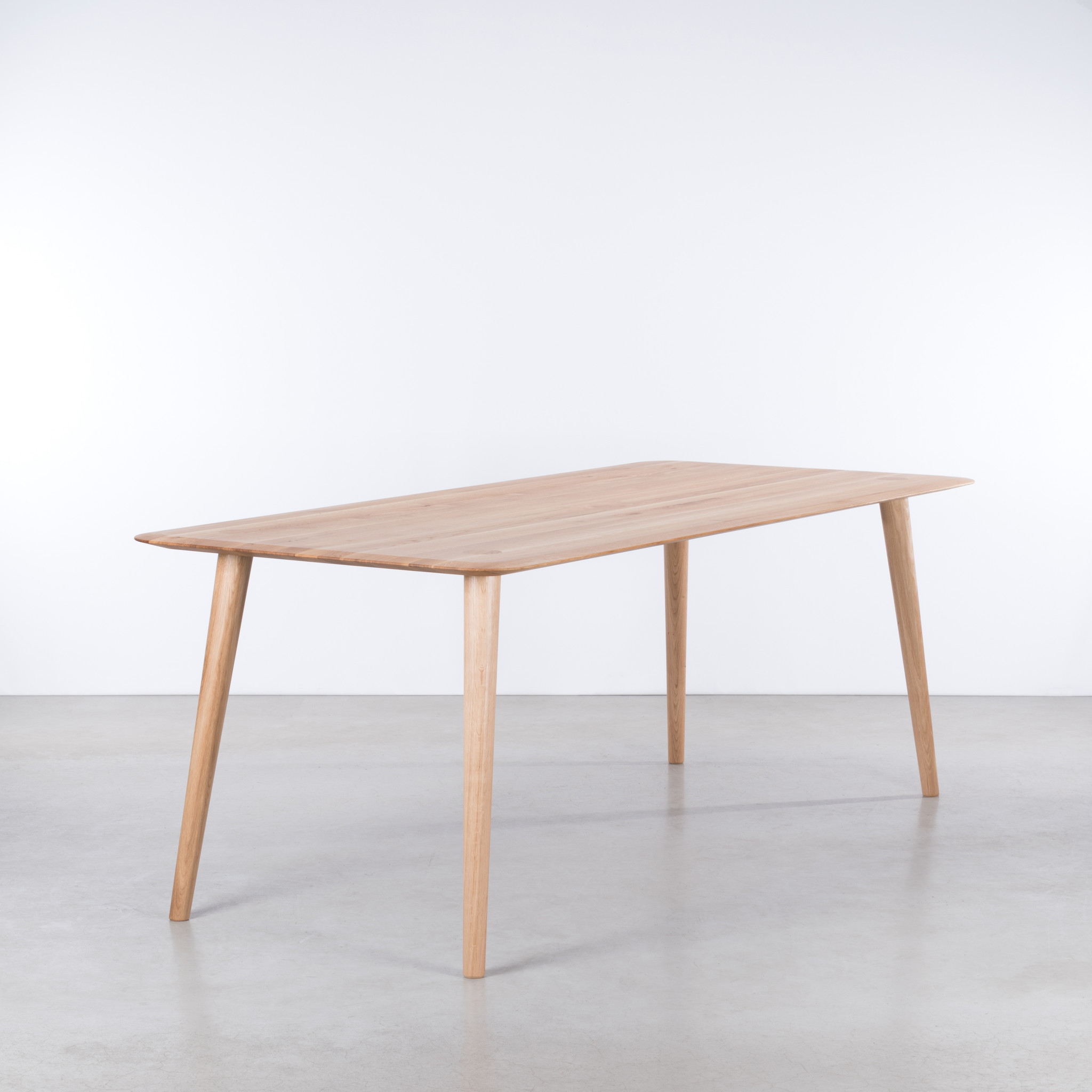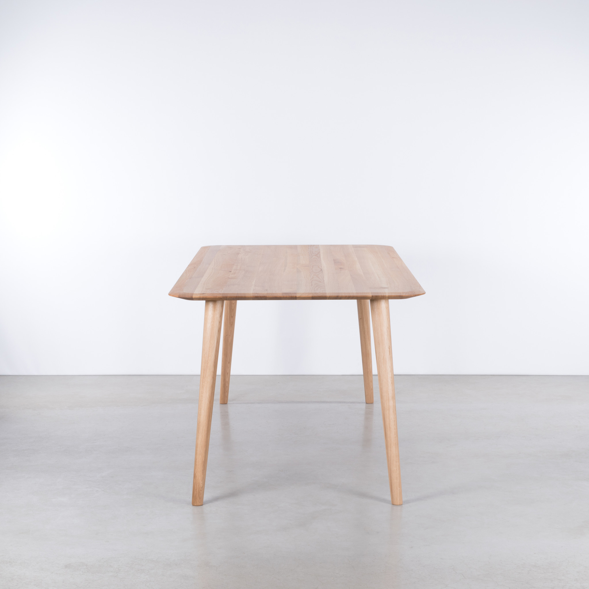 The Olger from this series can be described as modern Danish design. The table is characterized by its slender shape and special details. The most striking detail are the legs that extend into the top. The table legs protrude through the top and, like the top, are nicely finished. Special to see and beautifully executed. The legs are round in shape and placed diagonally under the table-top. Another nice detail is the thin, rejuvenated top with rounded corners.