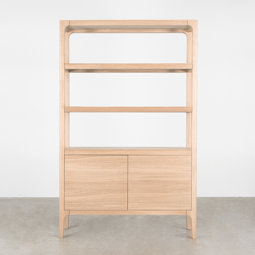 The doors of this cabinet are handleless, you can easily open them with a small push (push-to-open). The cabinet is made of solid wood, optionally in walnut or oak. The bookcase unmistakably comes from the Rikke family. The corners of the furniture are rounded on the inside and form a whole with the uprights.