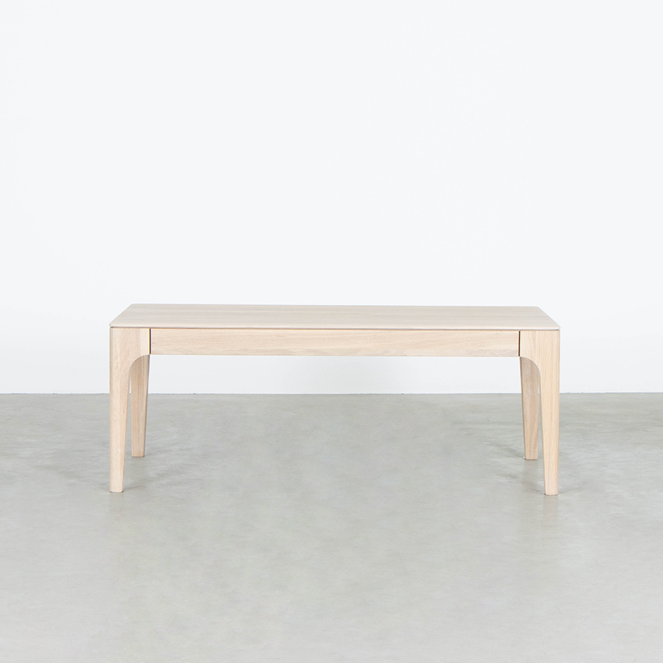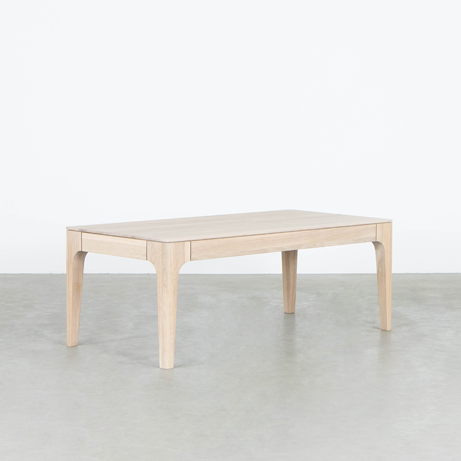 The Rikke coffee table is a welcome addition to the extensive Rikke collection. The coffee table is characterized by the same details as the dining tables and other Rikke furniture. Round shapes and a light appearance. Very subtly the leg merges into the leaf. The coffee table has narrow spaces between the top, bottom beam and table legs to allow the wood to work, which also enhances the design.