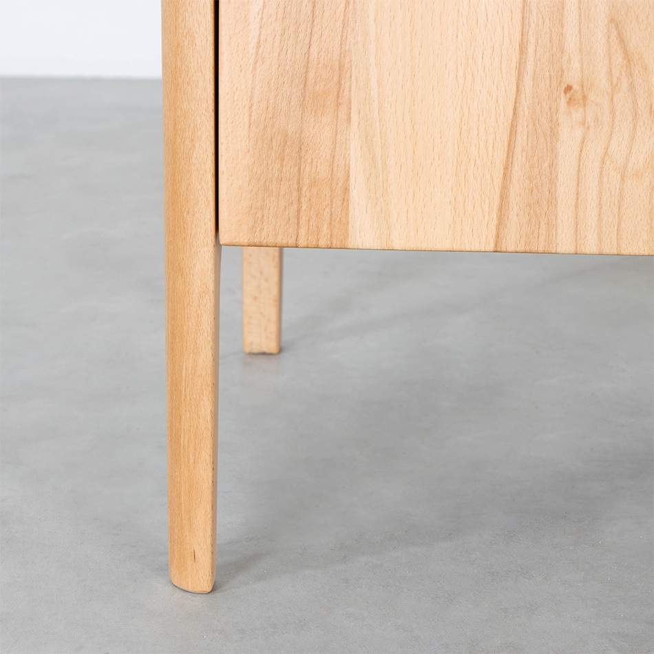 Are you looking for a special beech cabinet? The Rikke cabinet has the same rounded corners as the Rikke table, dining table bench and sideboard. It is a solid wood cabinet with a Scandinavian design. The legs form a flowing whole with the rest of the cabinet. The lines in the wood continue on the doors, bringing the natural play of lines into your living room. The highboard cabinet is available with two or three doors. It is available in beech, oak and walnut wood. The doors can also be made in coloured Fenix. There is always a Rikke cabinet available that matches your interior.