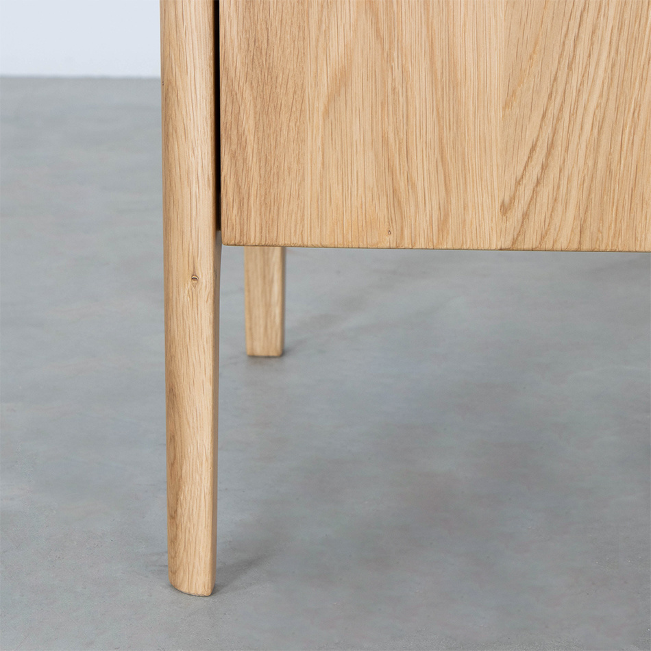 Are you looking for a special oak cabinet? The Rikke cabinet has the same rounded corners as the Rikke table, dining table bench and sideboard. It is a solid wood cabinet with a Scandinavian design. The legs form a flowing whole with the rest of the cabinet. The lines in the wood continue on the doors, bringing the natural play of lines into your living room. The highboard cabinet is available with two or three doors. It is available in beech, oak and walnut wood. The doors can also be made in coloured Fenix. There is always a Rikke cabinet available that matches your interior.