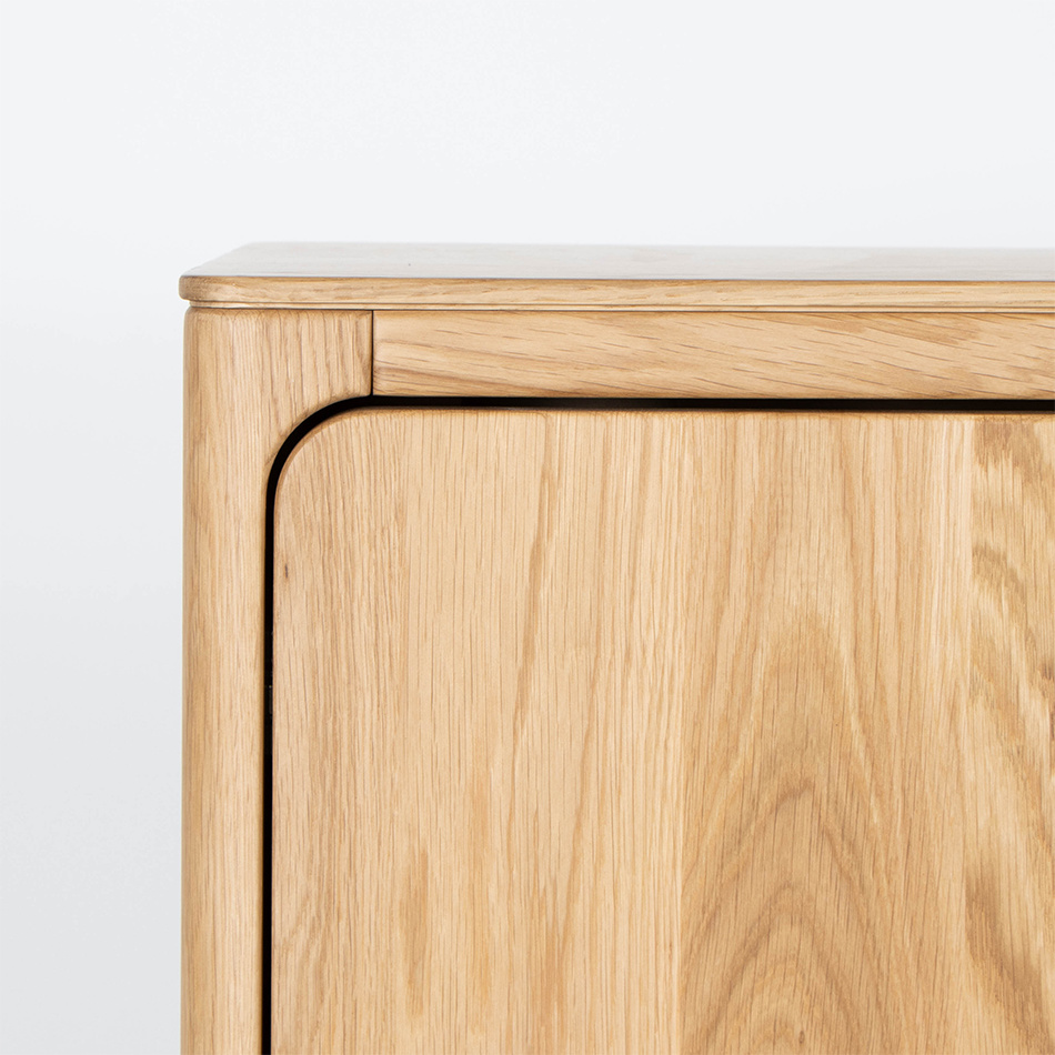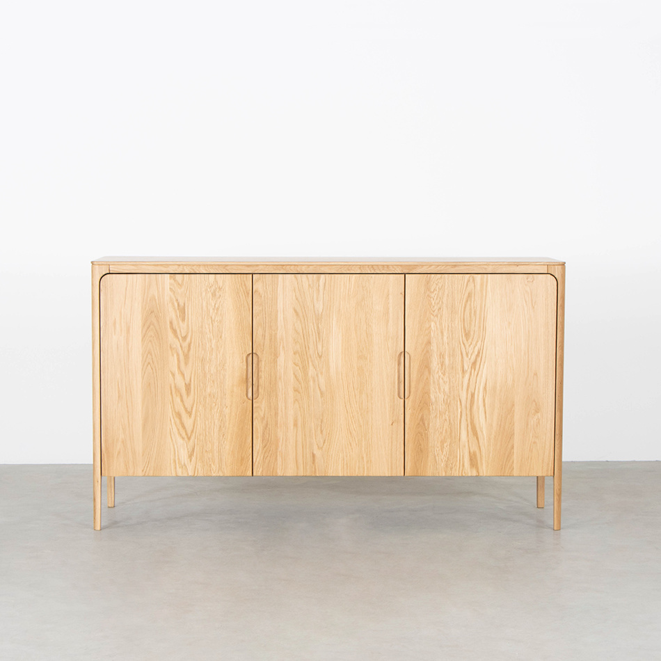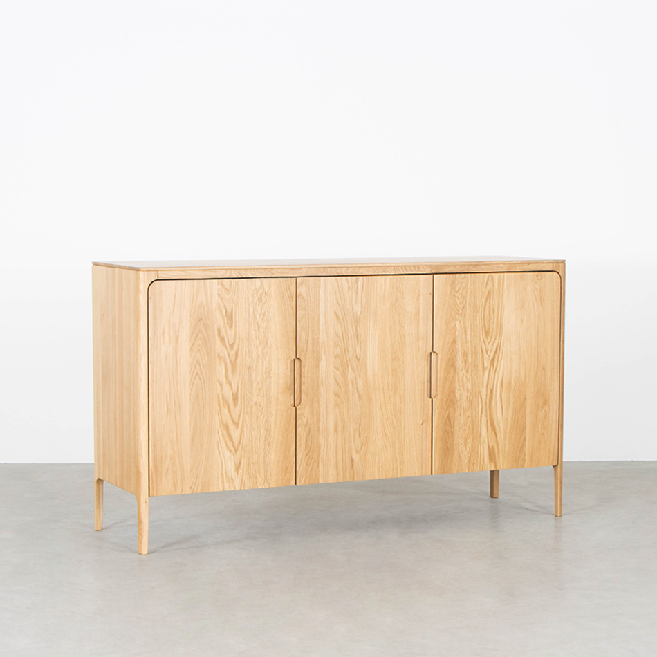 Are you looking for a special oak cabinet? The Rikke cabinet has the same rounded corners as the Rikke table, dining table bench and sideboard. It is a solid wood cabinet with a Scandinavian design. The legs form a flowing whole with the rest of the cabinet. The lines in the wood continue on the doors, bringing the natural play of lines into your living room. The highboard cabinet is available with two or three doors. It is available in beech, oak and walnut wood. The doors can also be made in coloured Fenix. There is always a Rikke cabinet available that matches your interior.