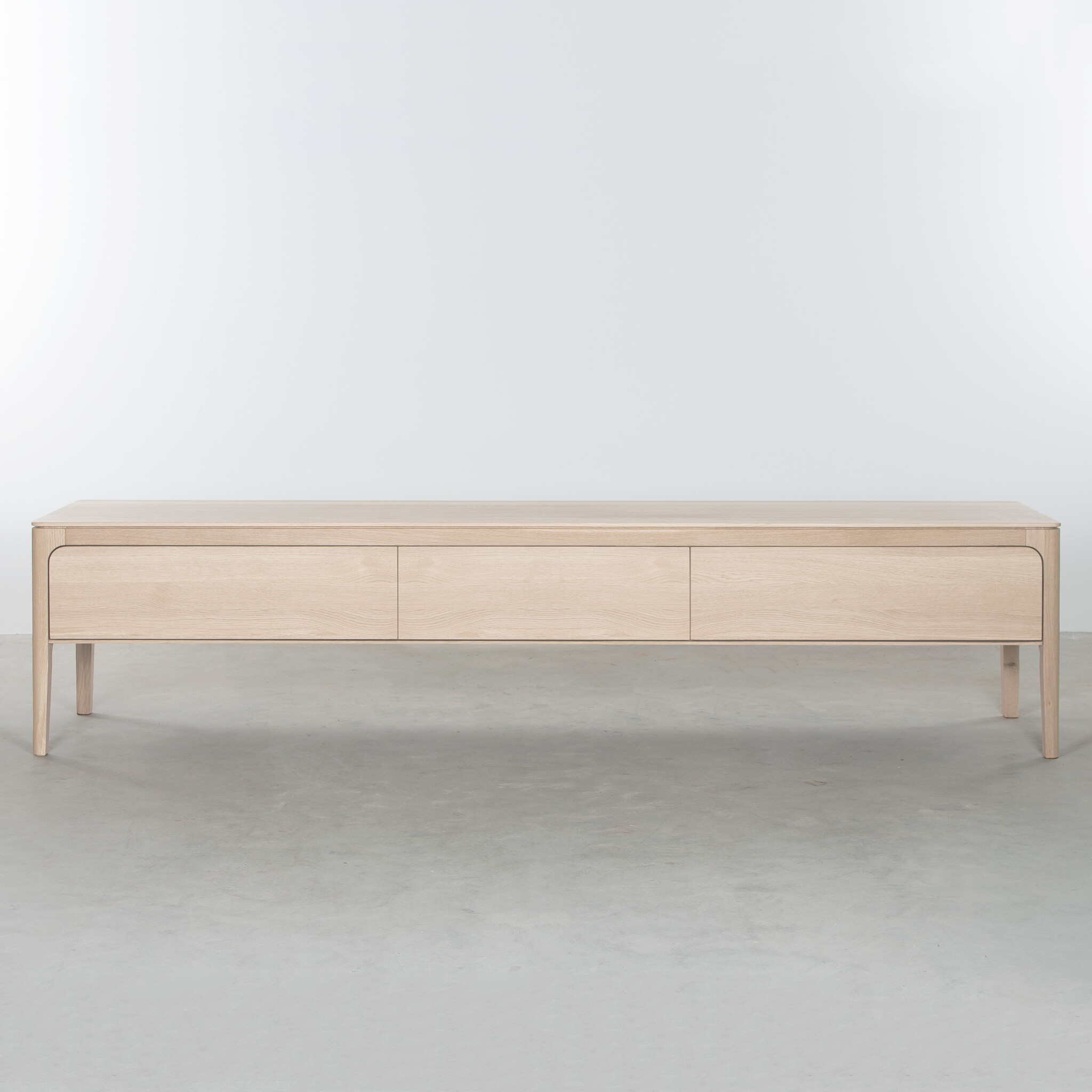 Are you looking for a special beech TV cabinet? The Rikke TV Cabinet is a solid wooden TV cabinet, with a Scandinavian design. This solid wooden furniture has round shapes and a light appearance. The legs continue in one subtle flowing movement.