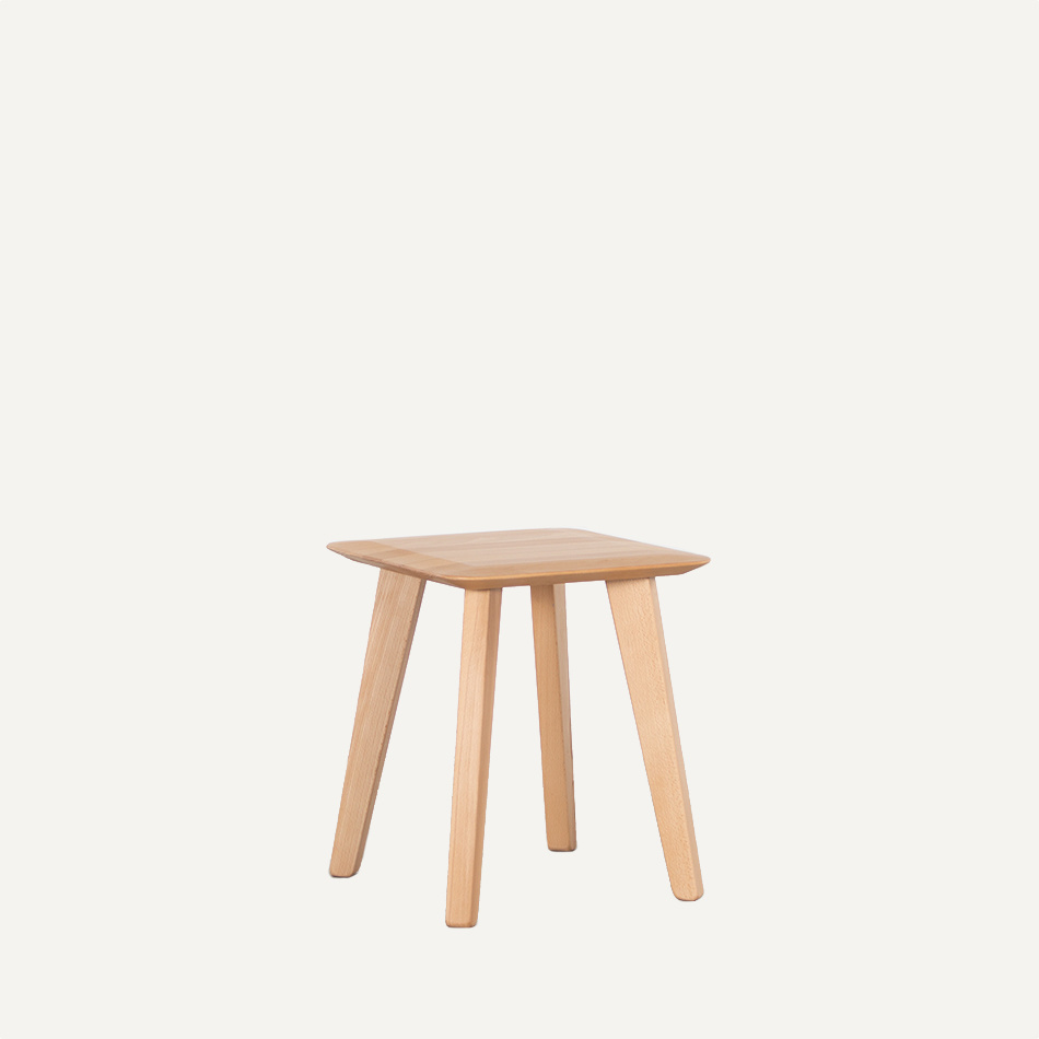 The Samt stool is characterized by its round corners and angled legs. This gives the Samt stool a light and playful character. A stool that looks light, but stands strong on its legs. Everything on the stool is smoothly finished. The seat is made of longitudinally continuous parts of more than 5 cm wide. The brim is inclined at both the top and bottom.