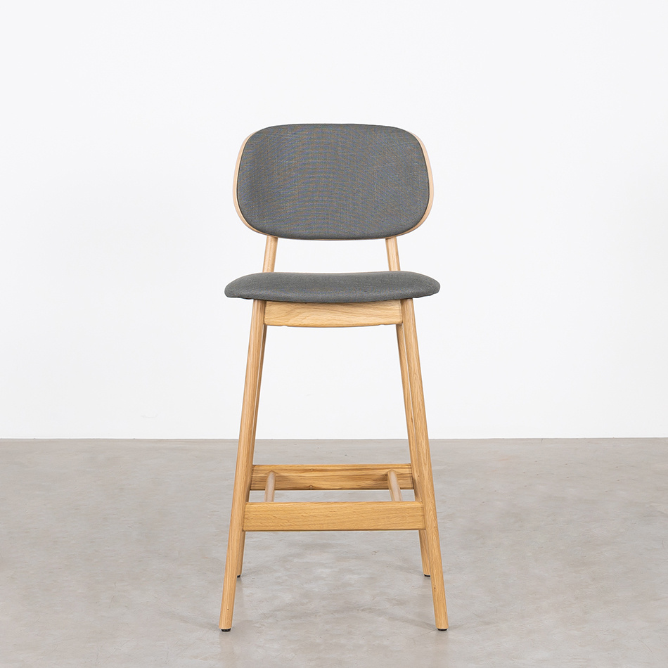 The Sinni counter bar chair with upholstered seat and back (seat height 69 cm) is a charming and timeless counter bar stool with a Scandinavian design. Like the other furniture from the Sav & Økse collection, the Sinni is designed from a practical and down-to-earth point of view. It is a counter bar chair with a friendly character and familiar appearance. The counter bar chair is made entirely of high-quality oak. The tapered legs support the curved seat and backrest. Without unnecessary details, this playful counter bar chair is beautiful to look at from every angle.
