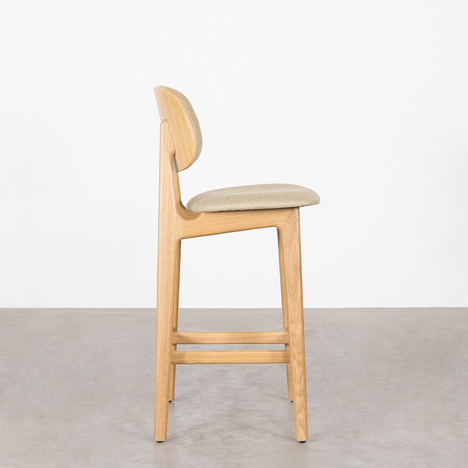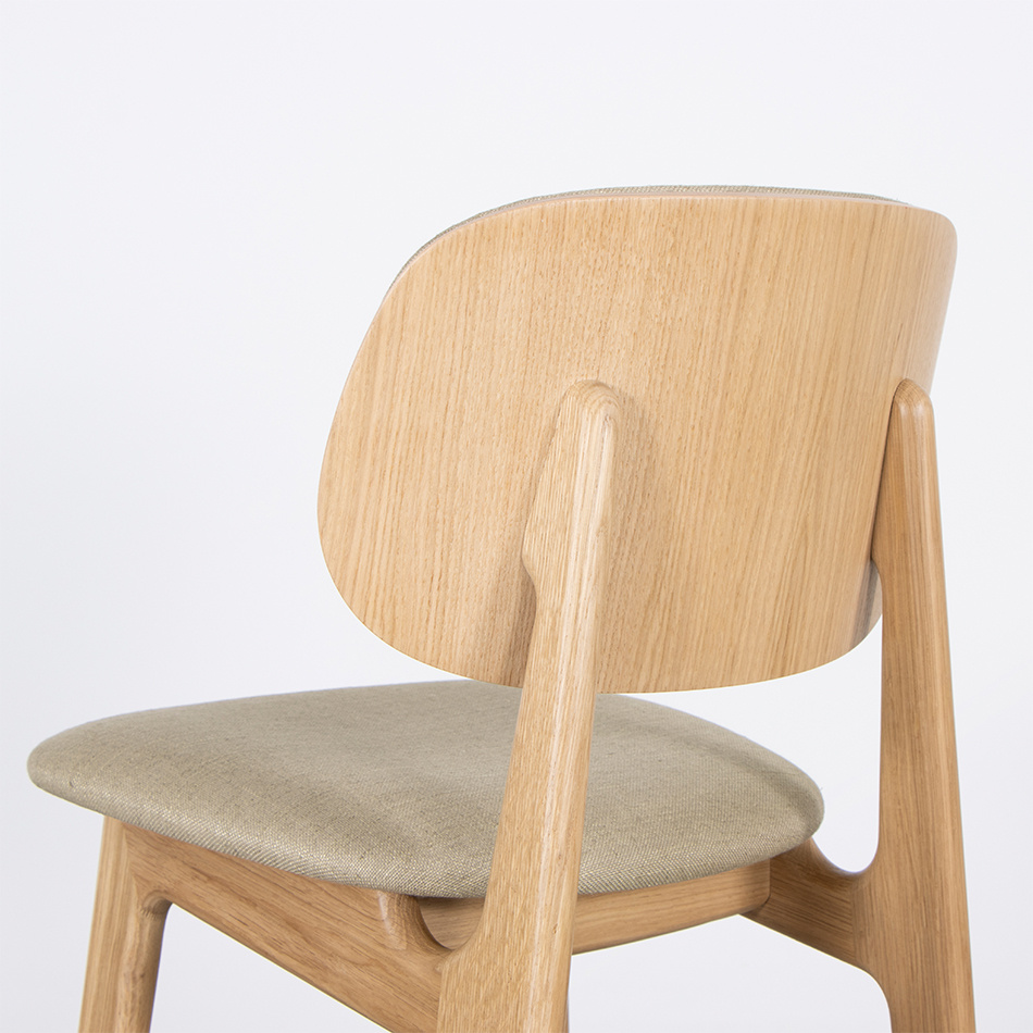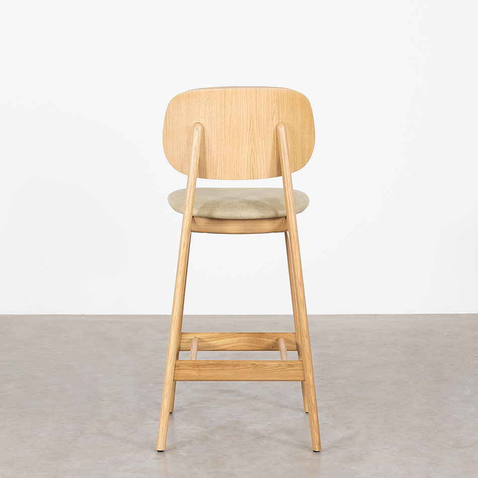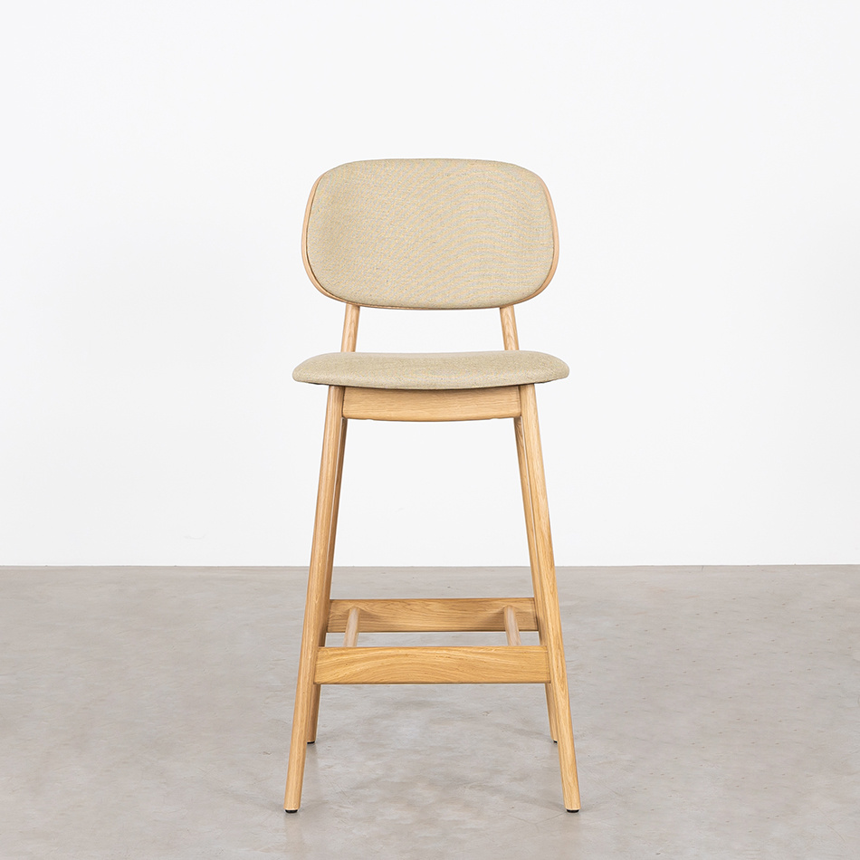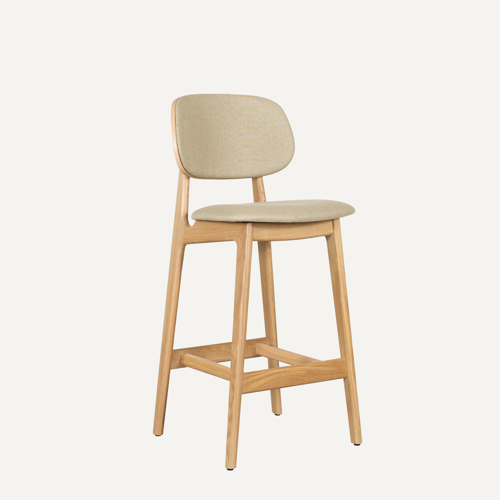 The Sinni counter bar chair with upholstered seat and back (seat height 69 cm) is a charming and timeless counter bar stool with a Scandinavian design. Like the other furniture from the Sav & Økse collection, the Sinni is designed from a practical and down-to-earth point of view. It is a counter bar chair with a friendly character and familiar appearance. The counter bar chair is made entirely of high-quality oak. The tapered legs support the curved seat and backrest. Without unnecessary details, this playful counter bar chair is beautiful to look at from every angle.