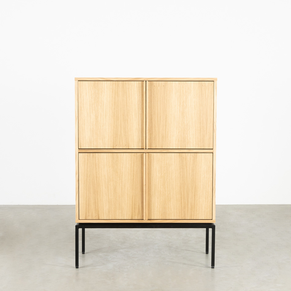 The four-door cabinet has a sleek, black metal frame. The solid wood handles have the same length as the doors. As applies to all Tempelman cabinets: the superfluous has been omitted, the design revolves around pure lines.
