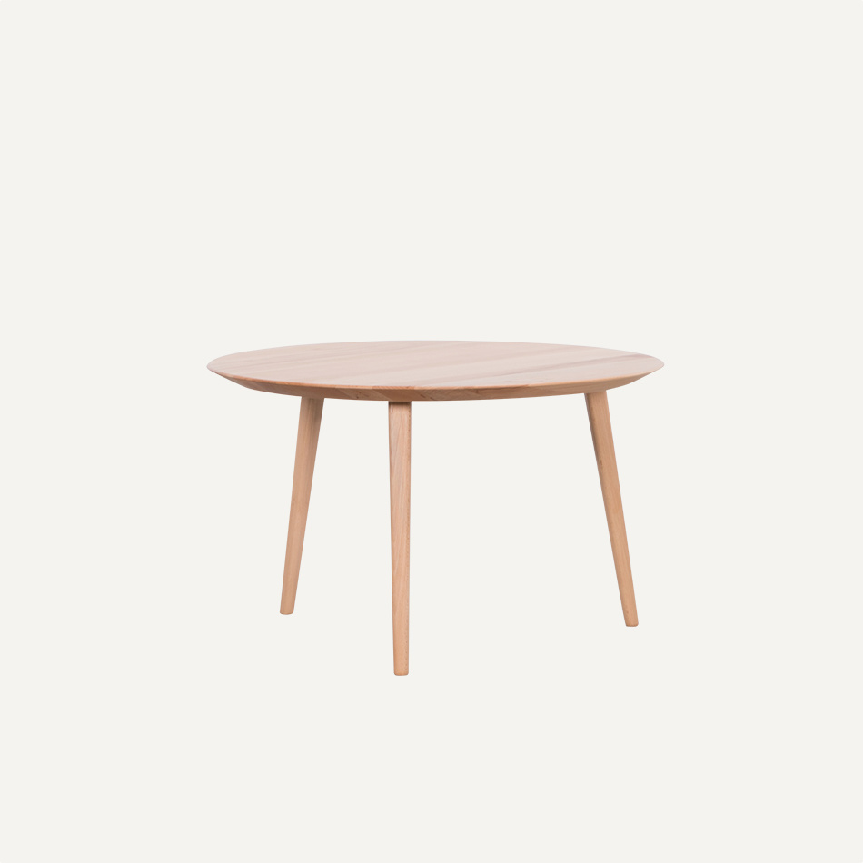 The Tomrer coffee table comes from the Sav & Økse collection. A collection of Scandinavian tables made of solid wood. Characteristic in their simplicity and quality. This is clearly reflected in the Tomrer coffee table. A table with a slender construction and a free lying top. This makes the table look light and soft. The edges are rejuvenated and the flowing lines of the design make the table cuddly. The legs are slightly slanted under the table-top and have rounded corners. Both the triangular and this round variant have three legs.