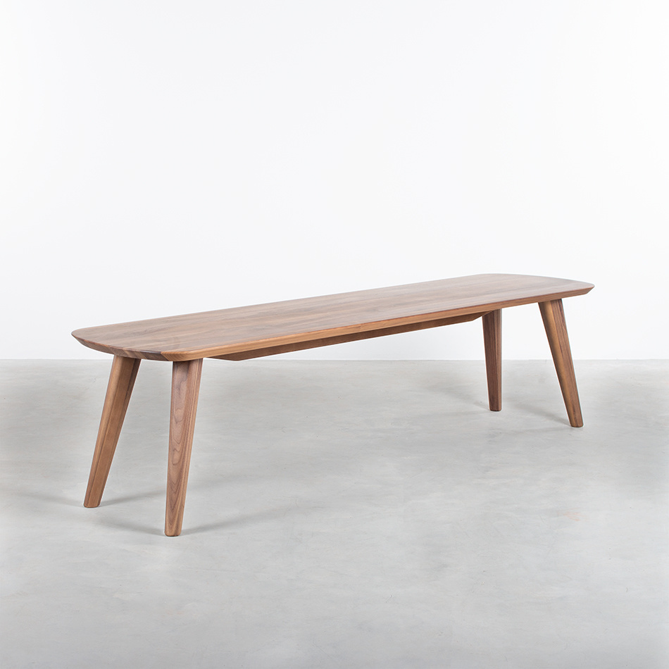 The Tomrer is a solid wooden bench in the Danish style of the 1960s. A retro bench with a fresh look. The combination of the slender construction with the slender top gives this sofa a light and soft appearance. The leaf is round at the end and is tapered at the edges. The legs are slightly slanted under the top and have rounded corners. No sharp edges or corners on this sofa.