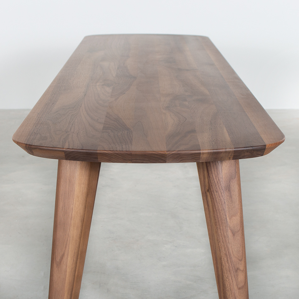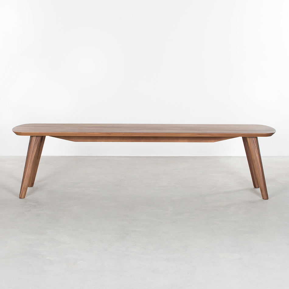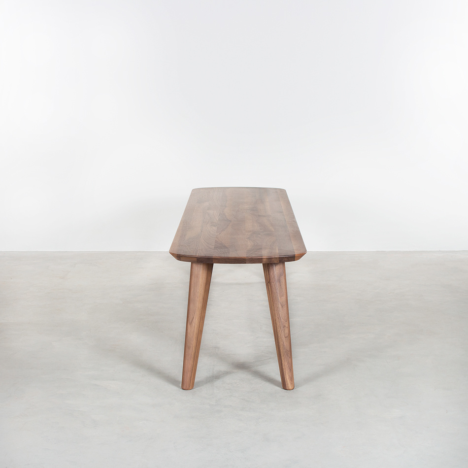 The dining table bench has a slender appearance, but can have a lot. For strength, metal sleepers are milled into the bottom shelf. In order to secure the plane in the longitudinal direction, there is a tension regulator under the table to prevent bending. Constructively, everything is neatly concealed.