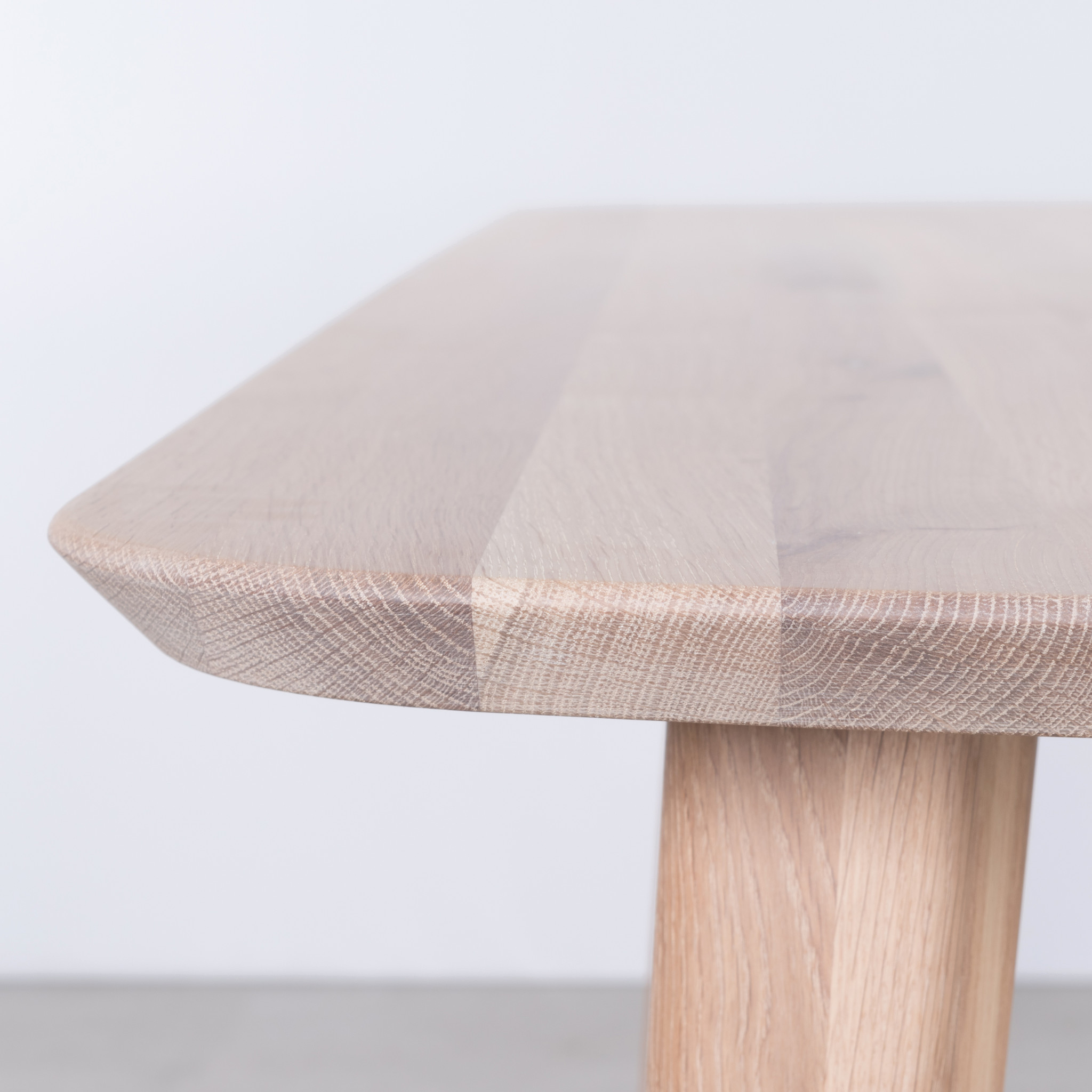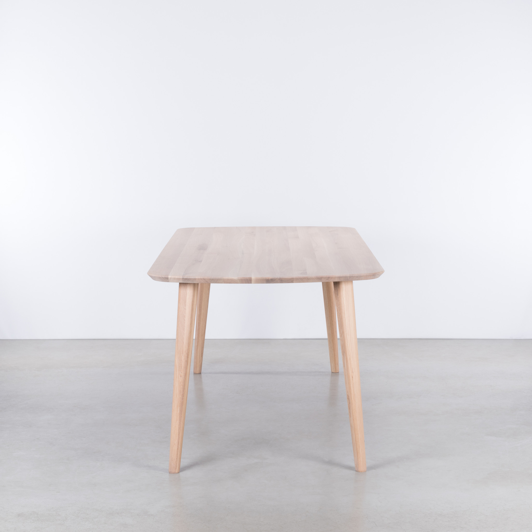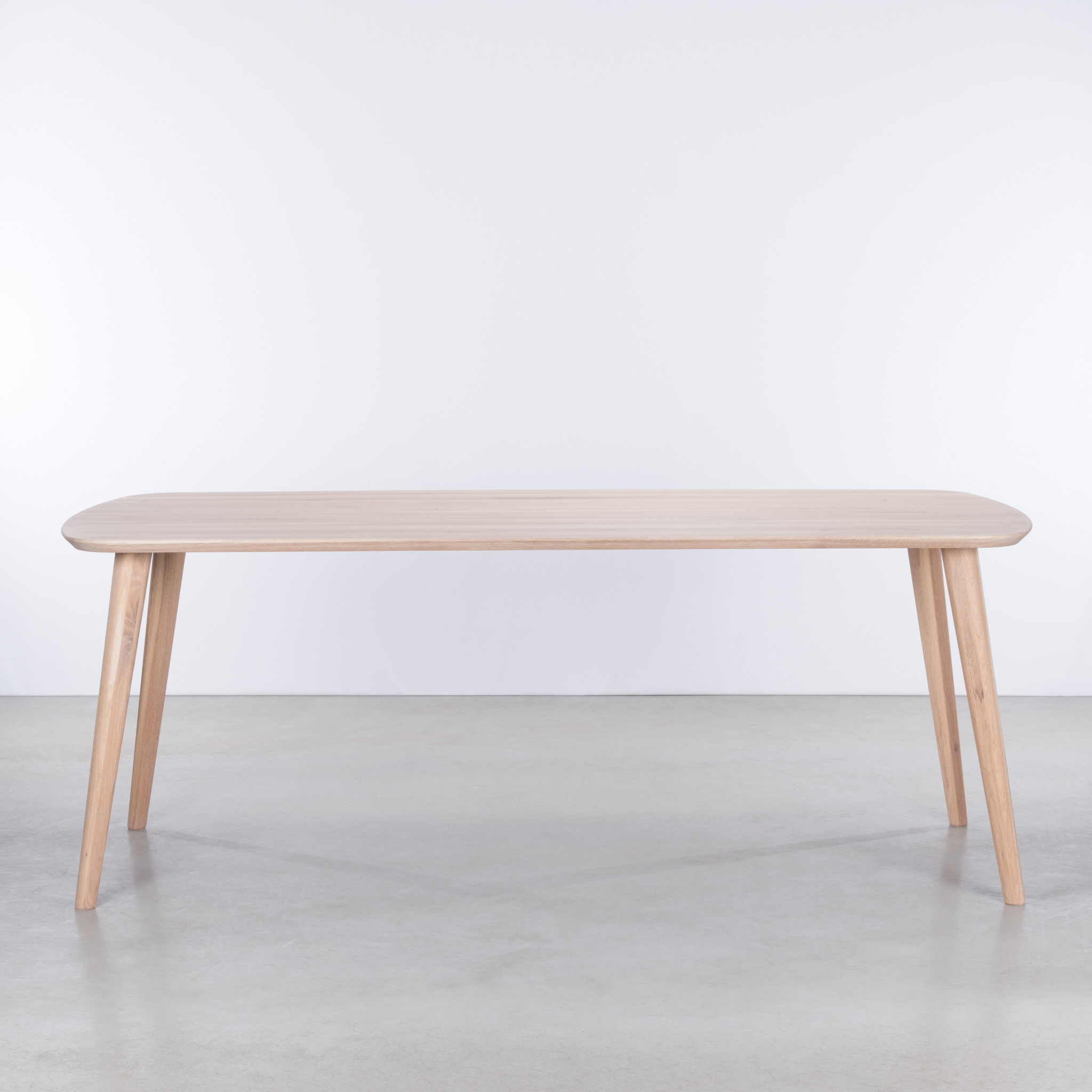 The Tomrer is a solid wood table in the Danish style of the 1960s. A retro table with a fresh look. The combination of the slender construction with the slender top gives this dining table a light and soft appearance. The table-top is round at the end and is tapered at the edges. The table legs are slightly slanted under the top and have rounded corners. No sharp edges or corners on this table.