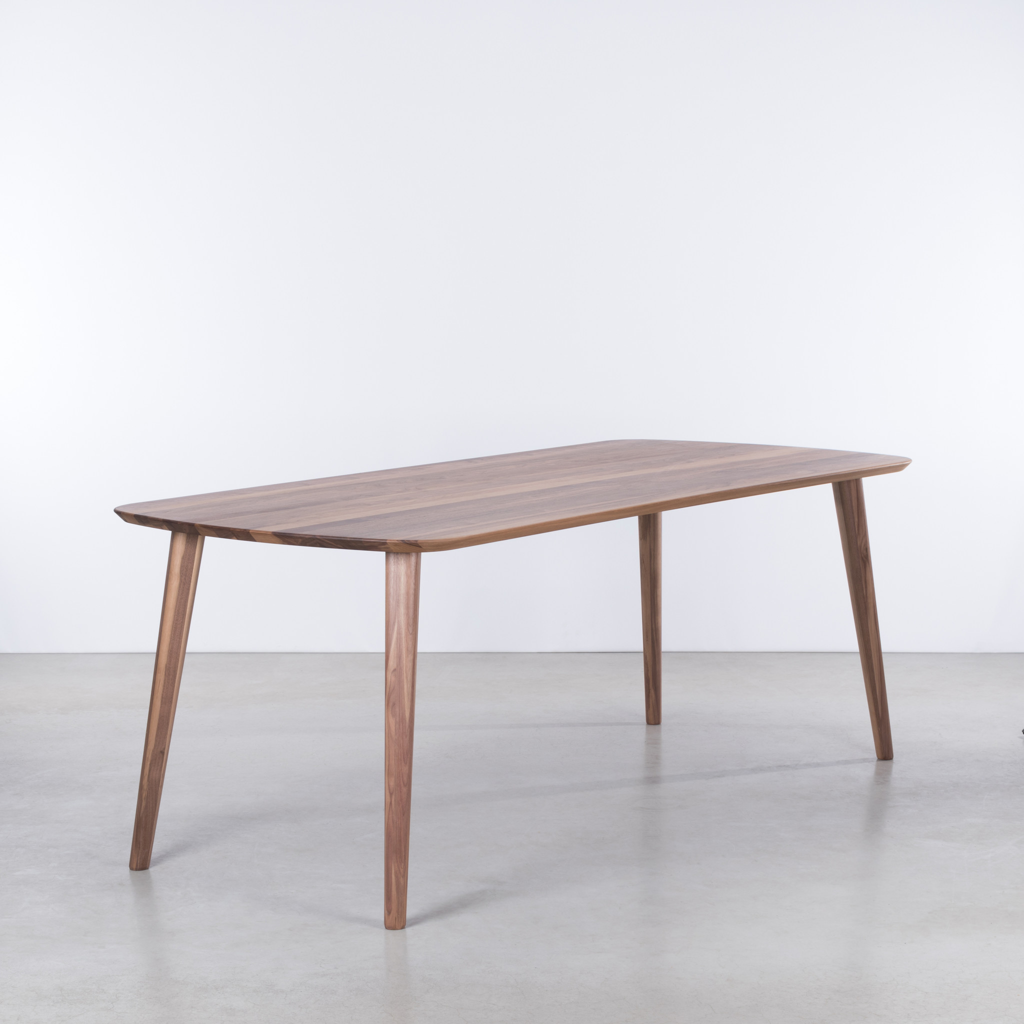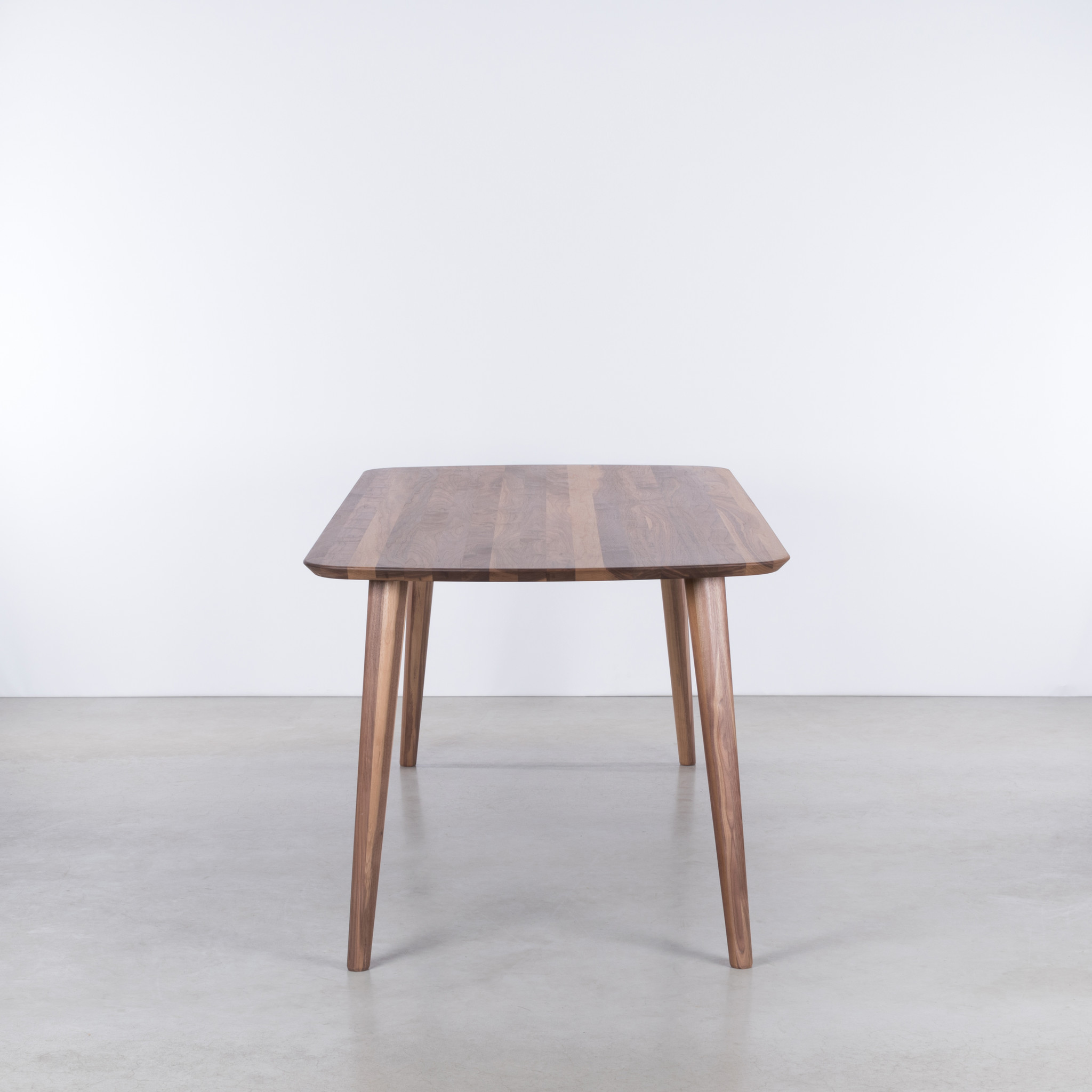 The Tomrer is a solid wood table in the Danish style of the 1960s. A retro table with a fresh look. The combination of the slender construction with the slender top gives this dining table a light and soft appearance. The table-top is round at the end and is tapered at the edges. The table legs are slightly slanted under the top and have rounded corners. No sharp edges or corners on this table.
