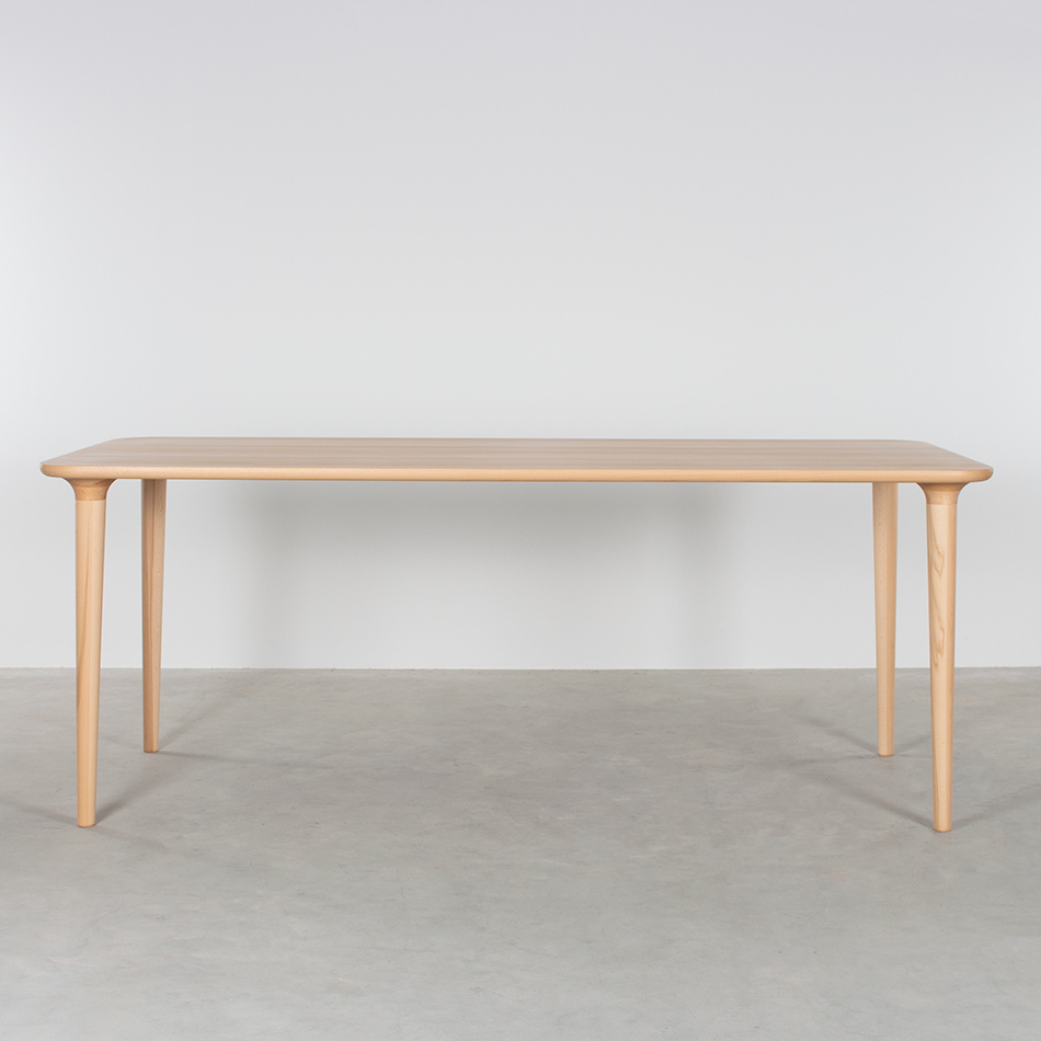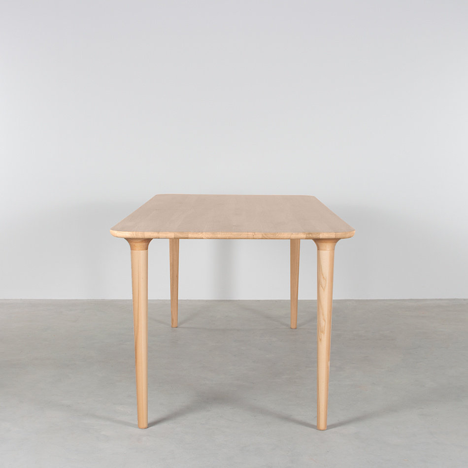 The Trompet is a minimalist, solid wooden table with beautiful round legs ending in the table-top. The table is characterized by rounded corners and slender design. The most striking detail is the tapered shape of the legs. The trumpet-shaped leg is almost cylindrical, with a slightly flared end piece. The table-top is rounded at the bottom, this forms a nice curve with the lines of the table leg.