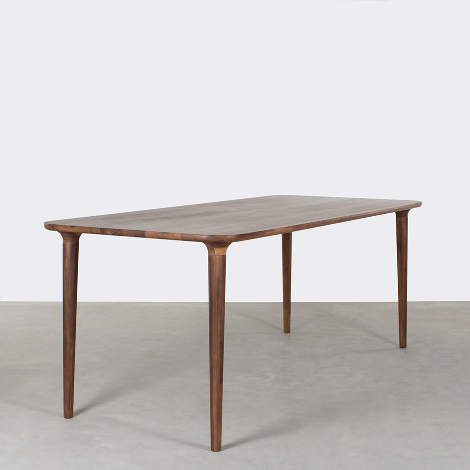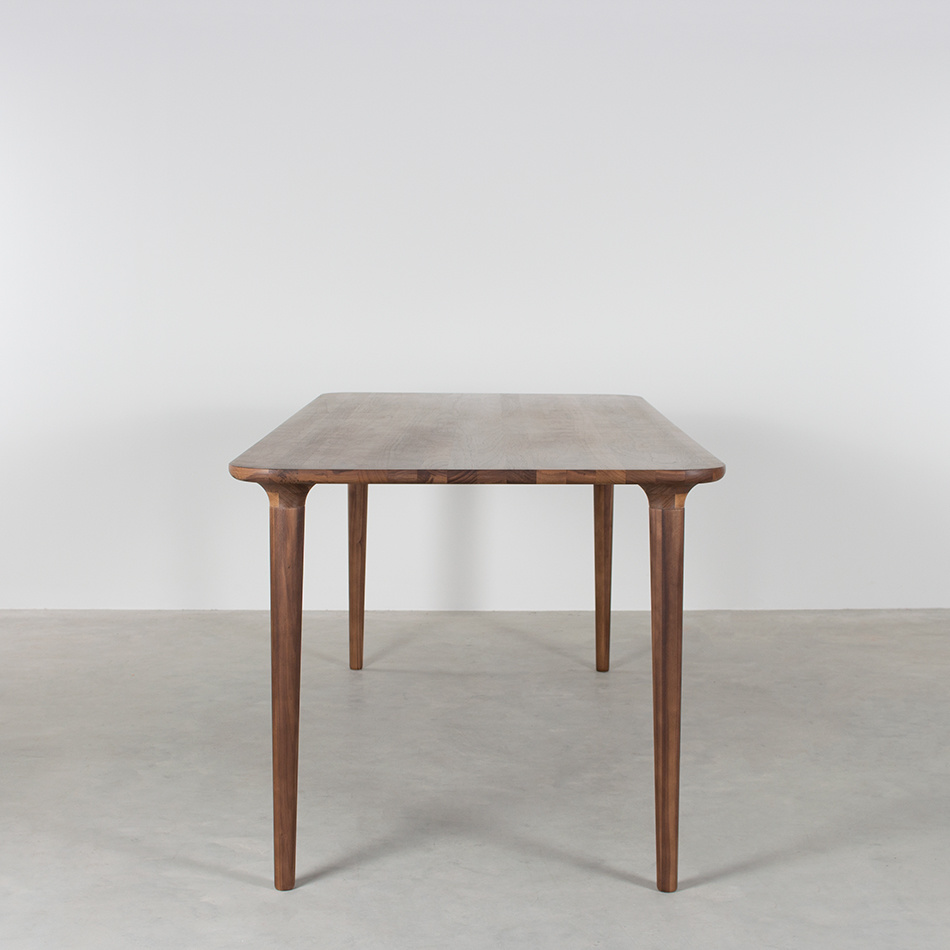 The Trompet is a minimalist, solid wooden table with beautiful round legs ending in the table-top. The table is characterized by rounded corners and slender design. The most striking detail is the tapered shape of the legs. The trumpet-shaped leg is almost cylindrical, with a slightly flared end piece. The table-top is rounded at the bottom, this forms a nice curve with the lines of the table leg.