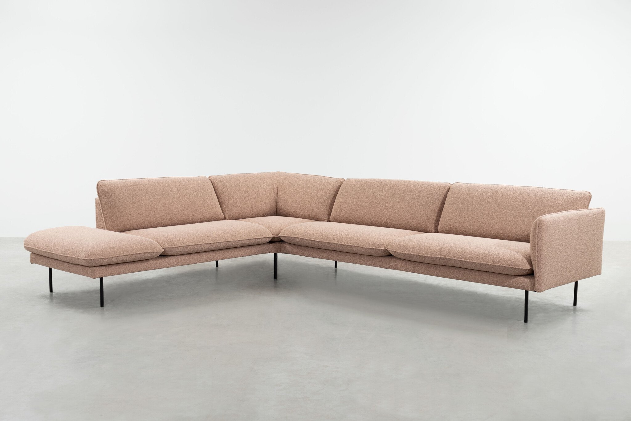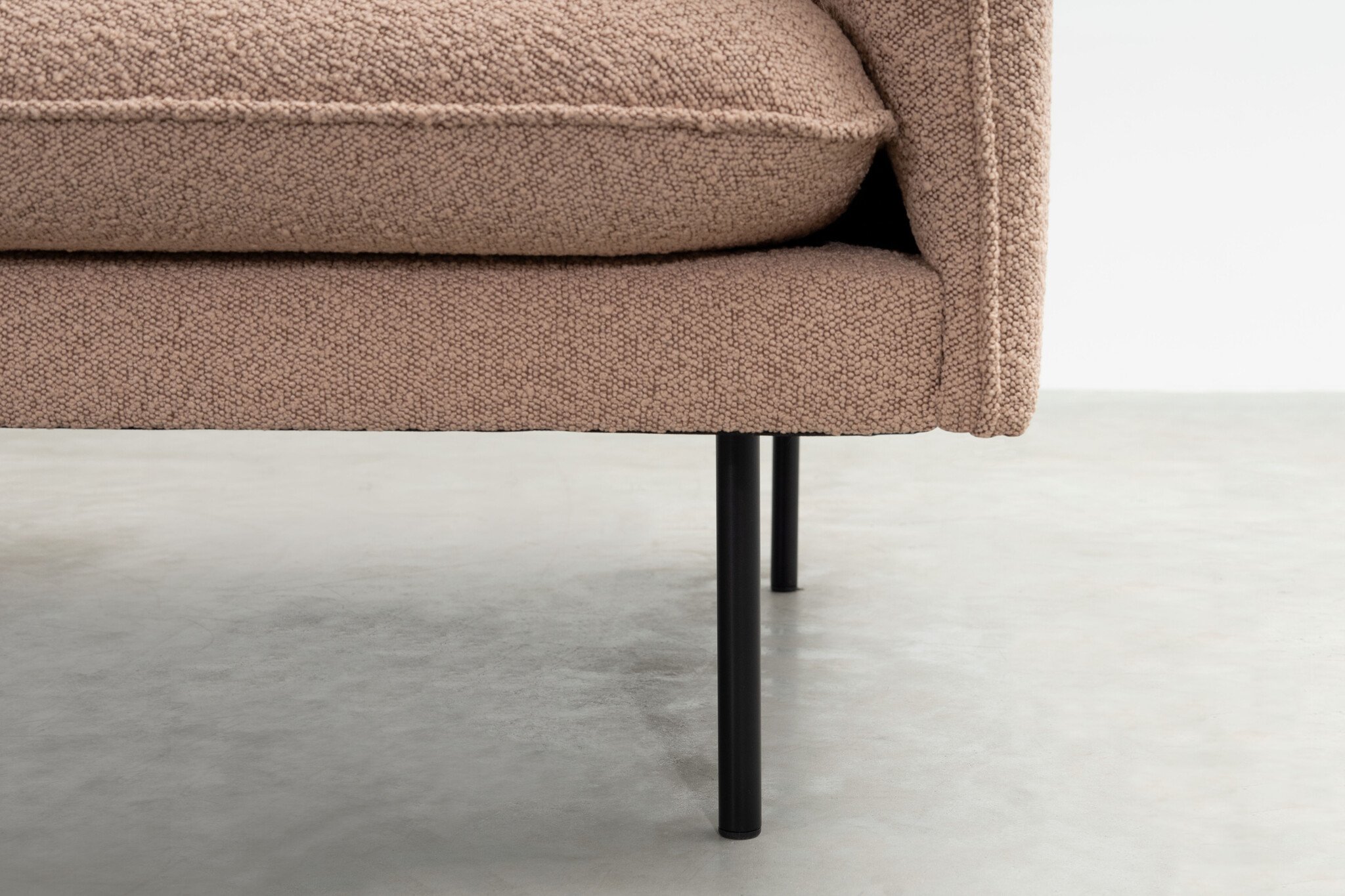 De poten van onze Jolin bank ogen rank, maar zijn van stevig, zwart gepoedercoat staal. Alle kussens zijn met klittenband aan het frame bevestigd, zodat ze goed op hun plaats blijven. De bank lijkt op het eerste gezicht op de Rølde, maar er zijn wel degelijk verschillen: de kussens van Jolin zijn afgewerkt met een piping bij de naden en de leuning van het hoekelement is driehoekig.