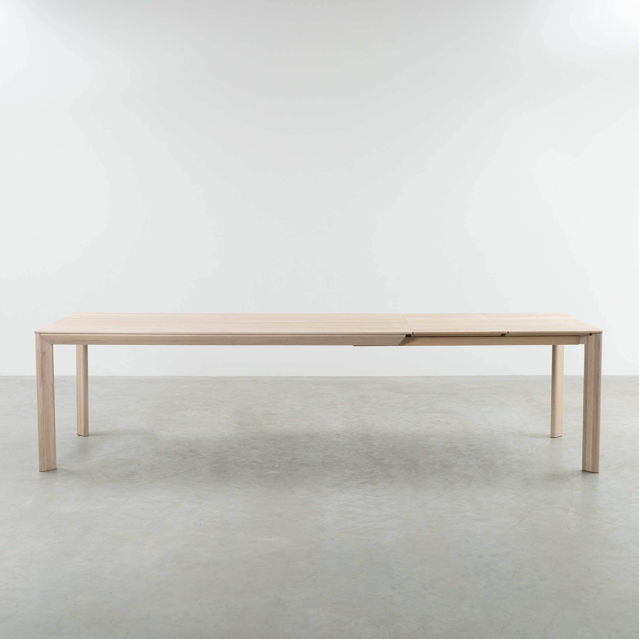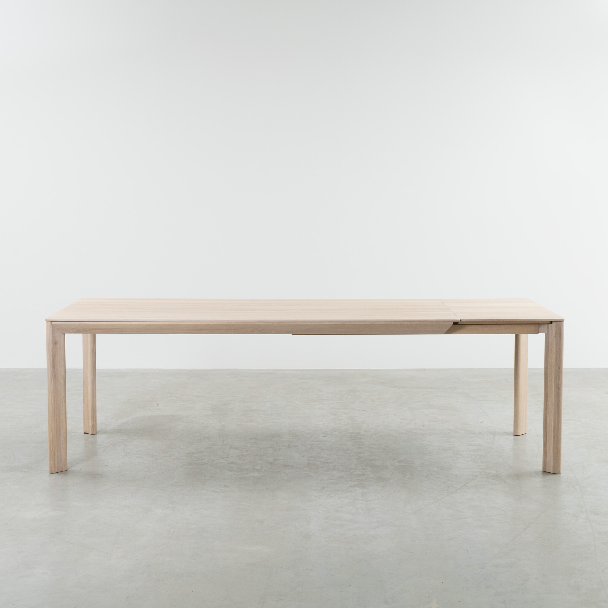 De uitschuifbladen van de uitschuifbare Eevi tafel hangen onder het tafelblad. Ze hangen hierbij enigszins schuin. Bij een massief houten tafel loopt de lijntekening van het hout niet door bij het uitgeschoven deel van de tafel. Kom eens langs in één van de showrooms om de uitschuifbare tafel te bekijken en de mogelijkheden met ons te bespreken.