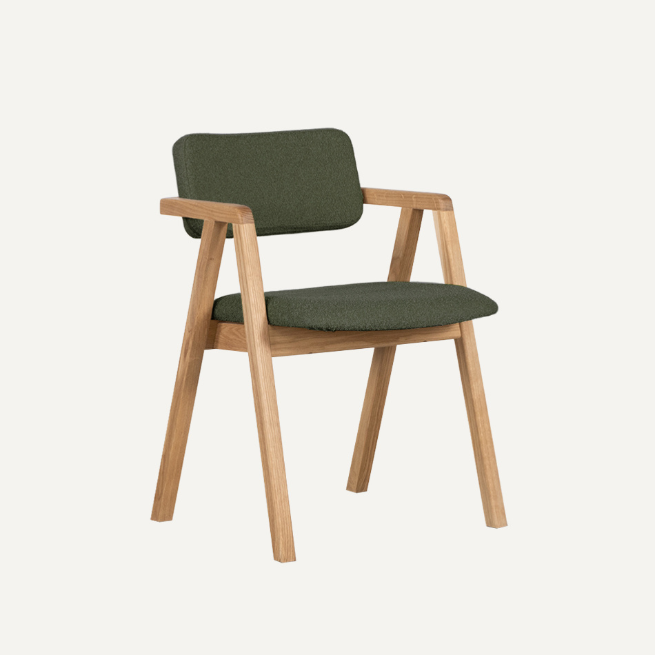 De grote kracht van stoel Enya is het fraaie A-frame van eikenhout. Het oogt stevig, aards en vriendelijk tegelijk. Heel nuchter, niks hoog in de bol. Het maakt deze stoel een stabiele waarde rondom de eettafel. Een favoriete ankerplek in je huis.