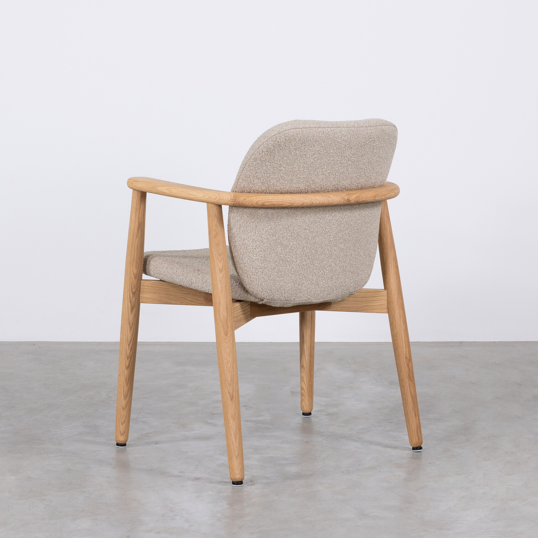 Eetkamerstoel Kaisa valt op door haar verfijnde details en uitgekiende proporties. De ronde armleuningen en de naadloze overgang naar de rugleuning geven de stoel een vloeiende en elegante uitstraling. Het massief eikenhouten frame is zorgvuldig afgewerkt met een olie, wat de natuurlijke schoonheid van het hout benadrukt. Kaisa is een stevige stoel en biedt veel zitcomfort dankzij de gestoffeerde zitting en rugleuning. De gestoffeerde zitting en rugleuning is leverbaar in verschillende stofsoorten en kleuren, zodat je kunt kiezen wat het beste bij jouw interieurstijl past.