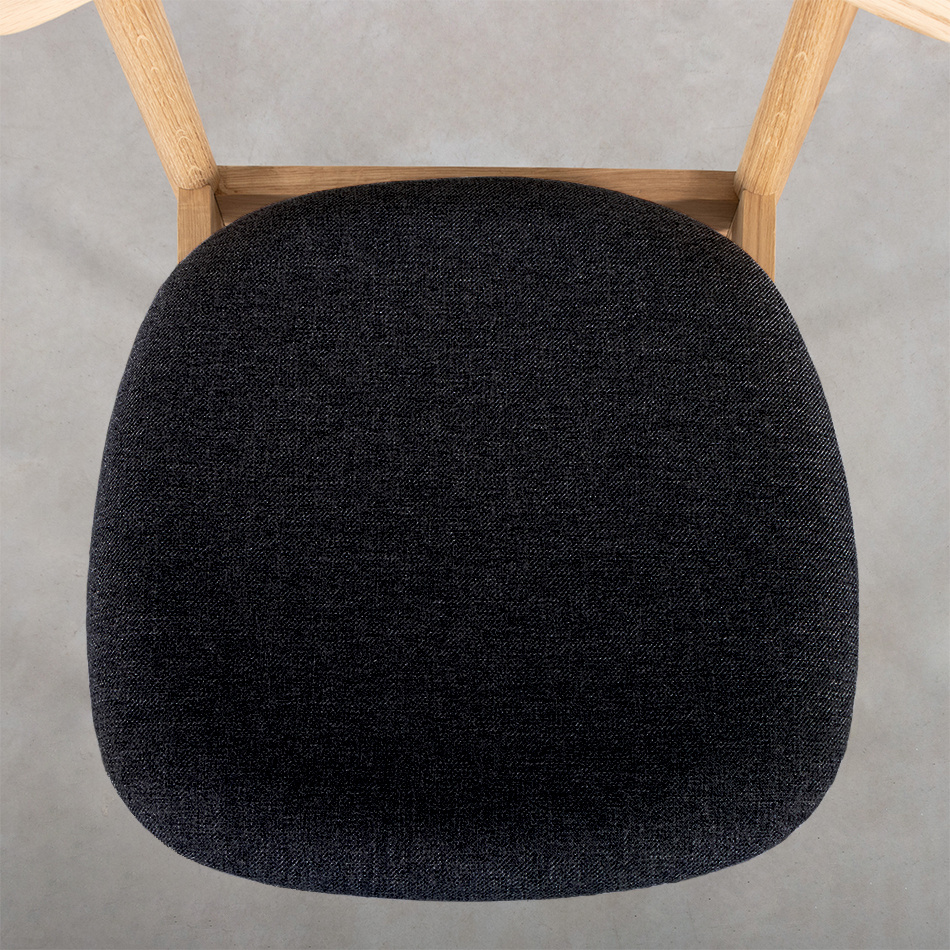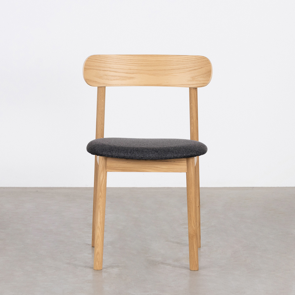 Het eikenhout wordt standaard afgewerkt met olie. De gestoffeerde zitting en rugleuning zijn leverbaar in verschillende stofsoorten en kleuren.