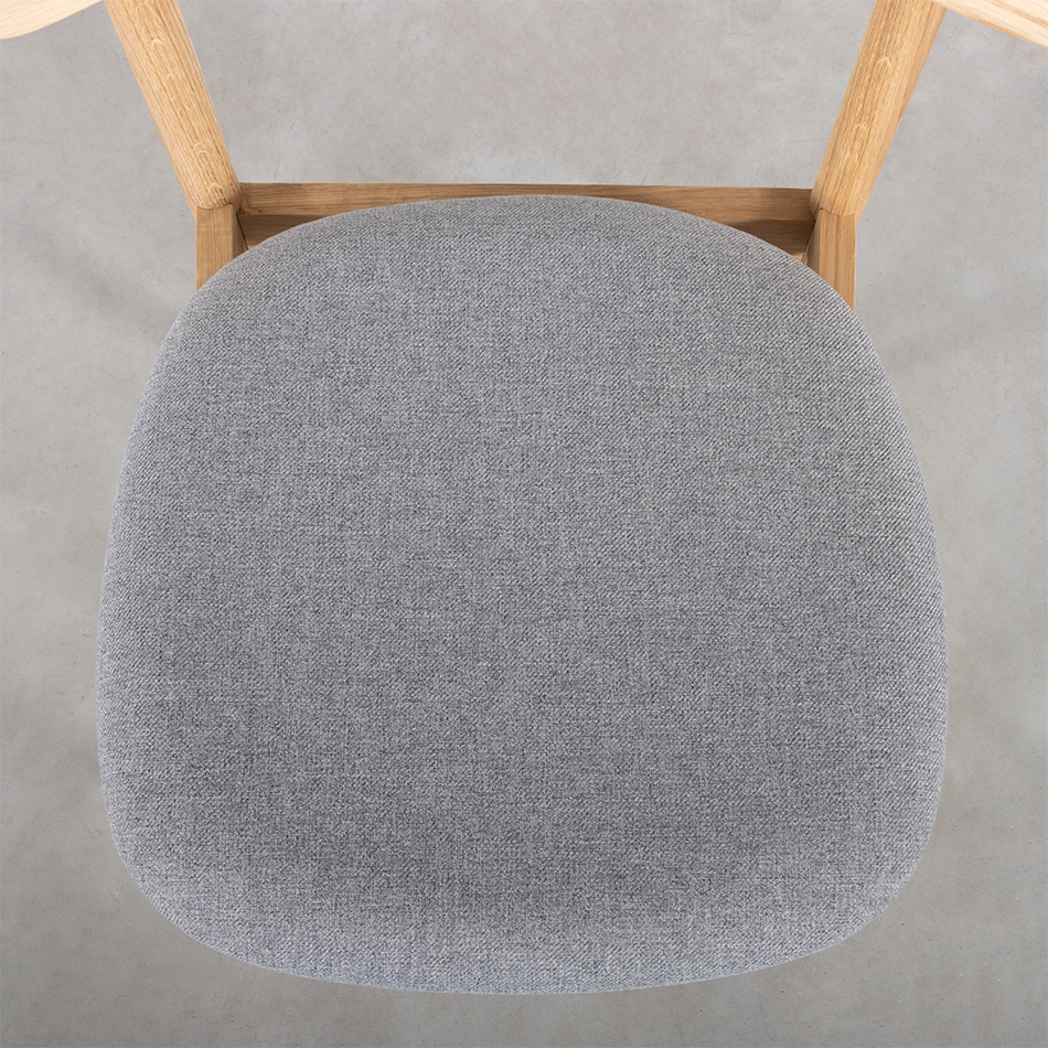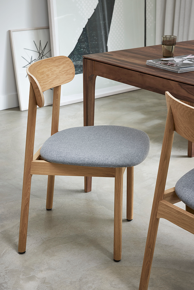 Het eikenhout wordt standaard afgewerkt met olie. De gestoffeerde zitting en rugleuning zijn leverbaar in verschillende stofsoorten en kleuren.