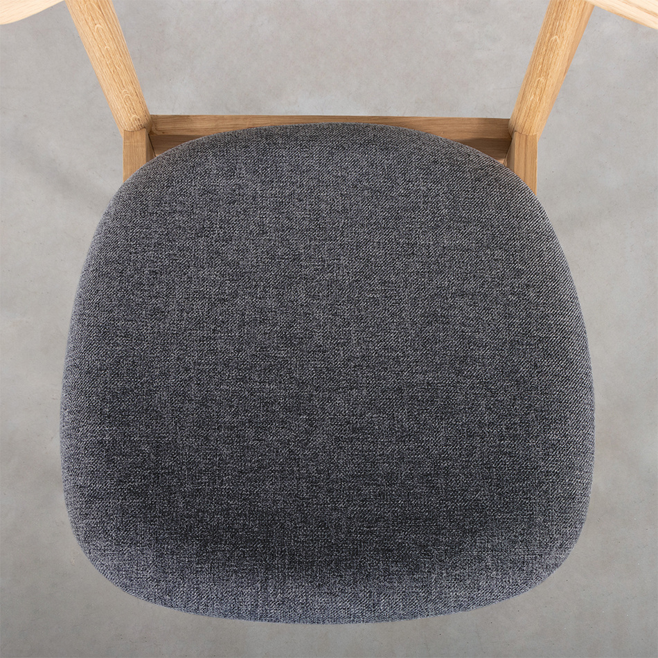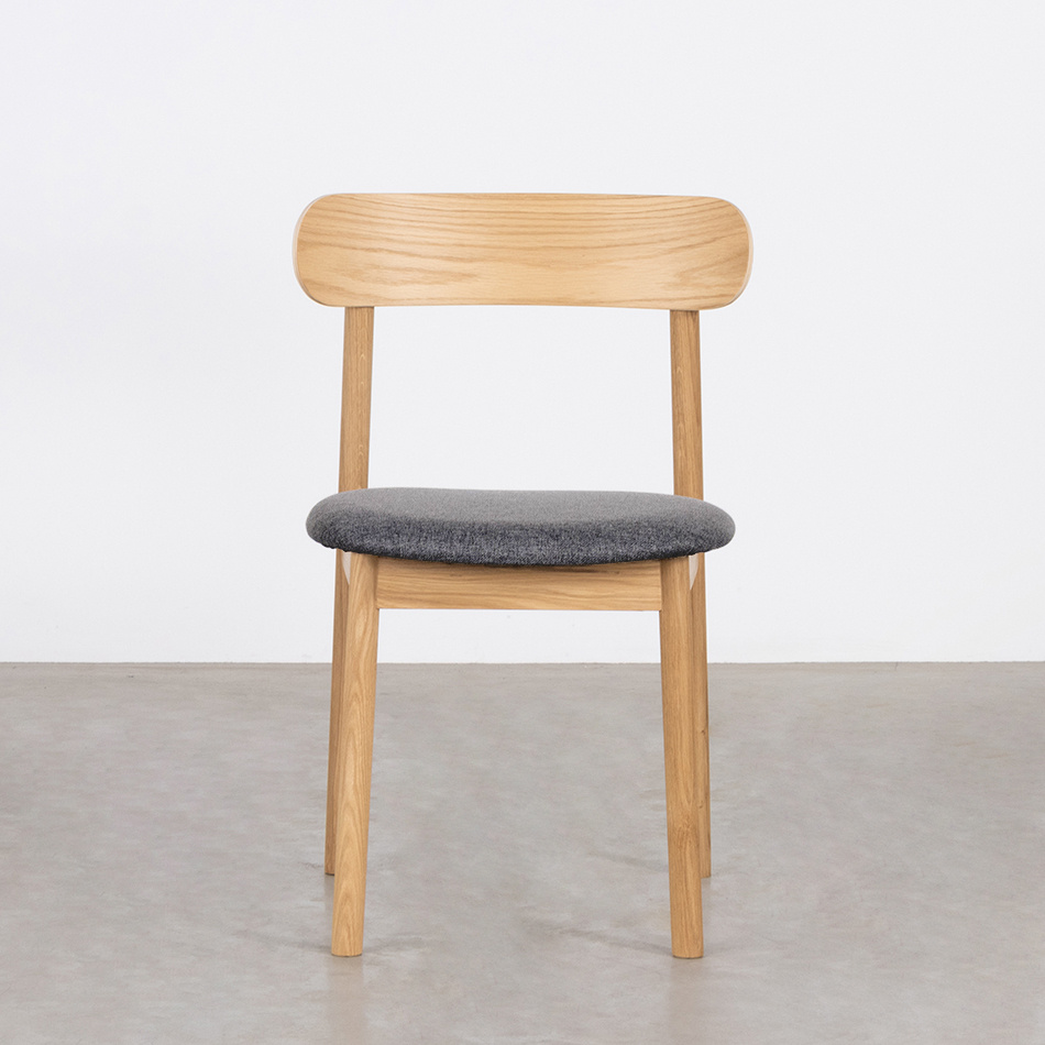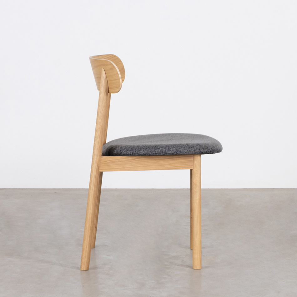 Het eikenhout wordt standaard afgewerkt met olie. De gestoffeerde zitting en rugleuning zijn leverbaar in verschillende stofsoorten en kleuren.