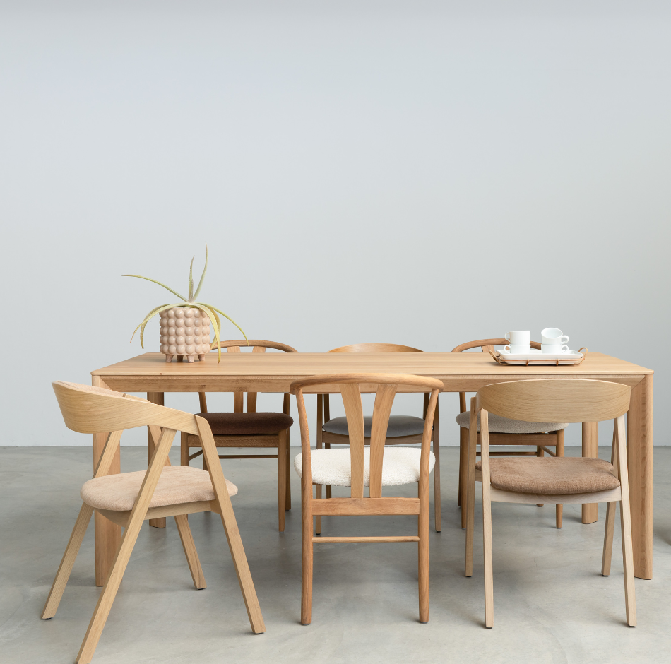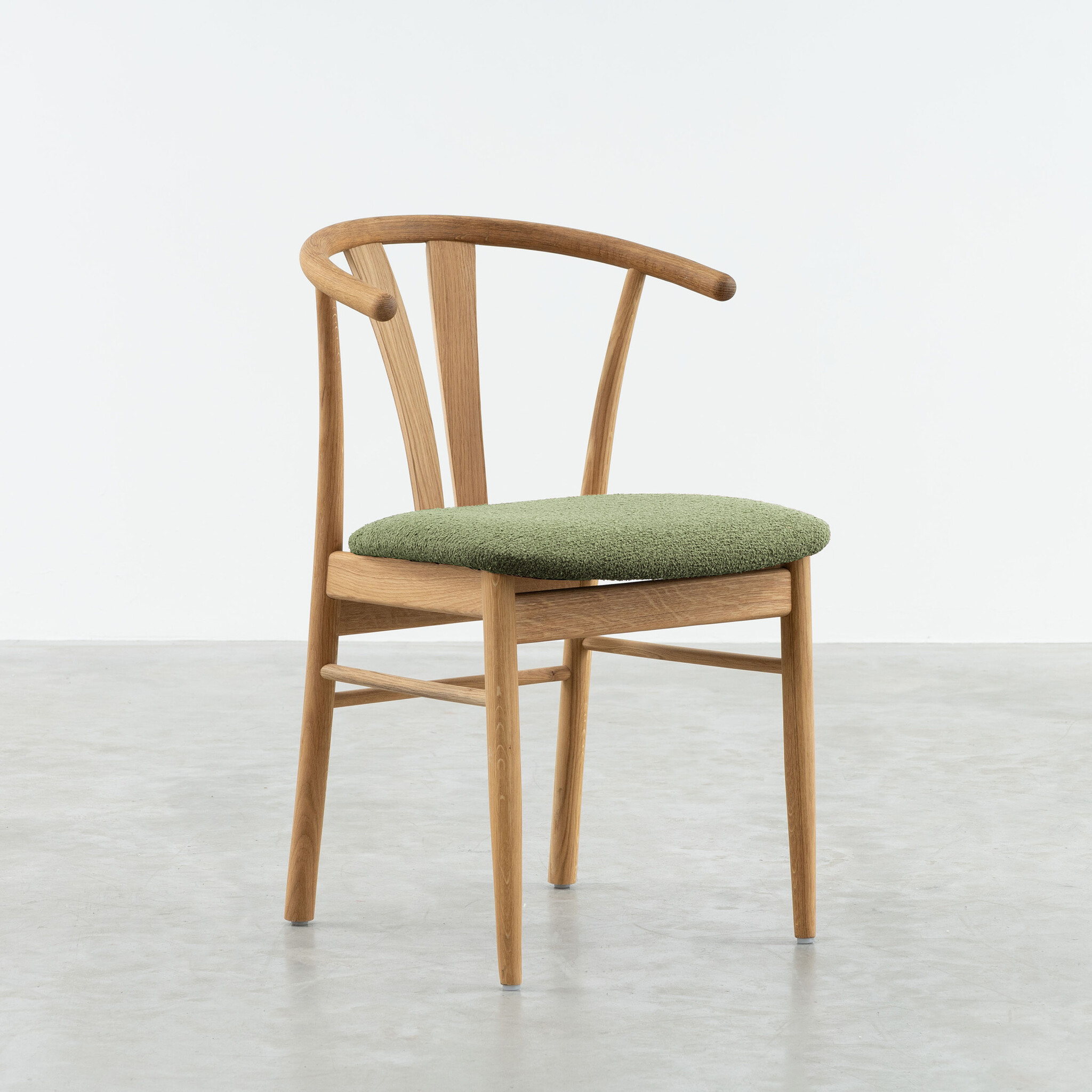 Met luchtige elegantie zet stoel Miias de toon rond de eettafel. De eikenhouten ronde stoel met gestoffeerde zitting heeft een kenmerkende rugleuning. Daarmee draagt Miias bij aan een warme en open sfeer en een minimalistisch interieur.
