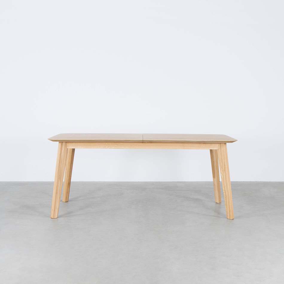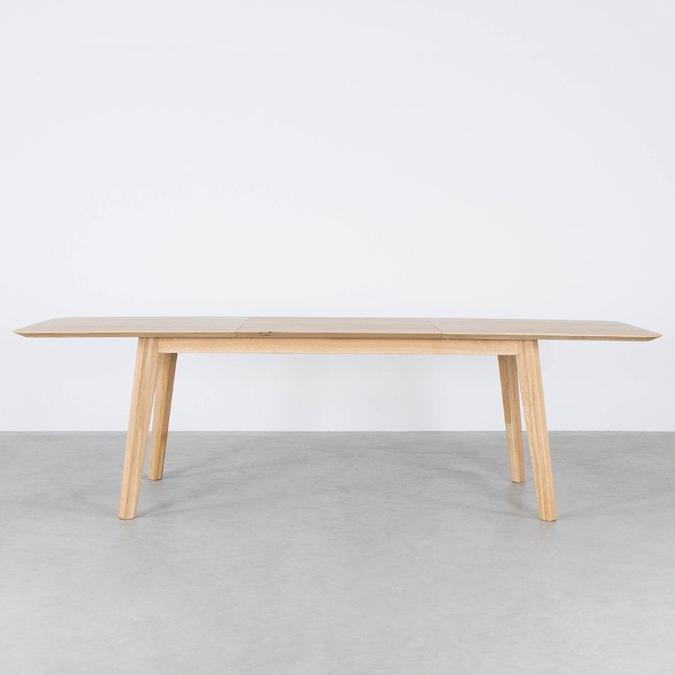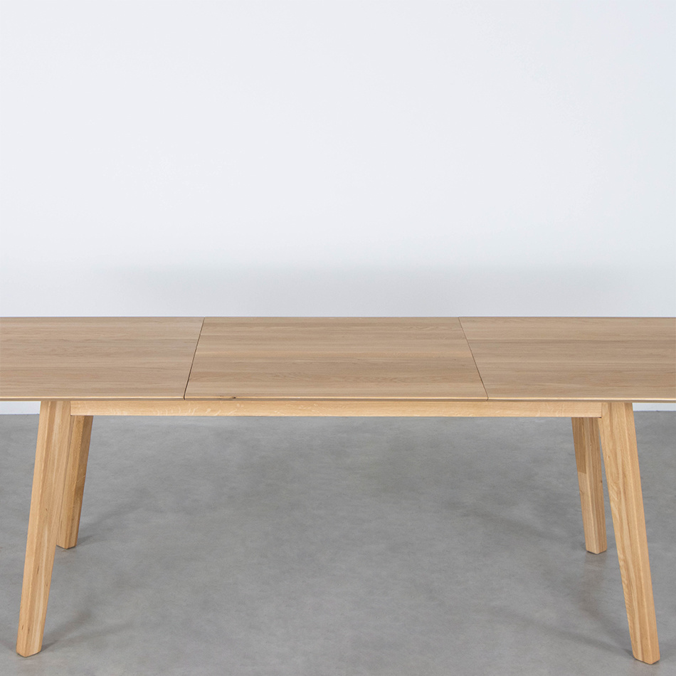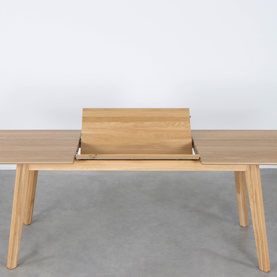 De uitschuifbladen van de tafel hangen onder het tafelblad. Ze hangen hierbij enigszins schuin. Bij een massief houten tafel loopt de lijntekening van het hout niet door bij het uitgeschoven deel van de tafel. Kom eens langs in één van de showrooms om de uitschuifbare tafel te bekijken en de mogelijkheden met ons te bespreken.