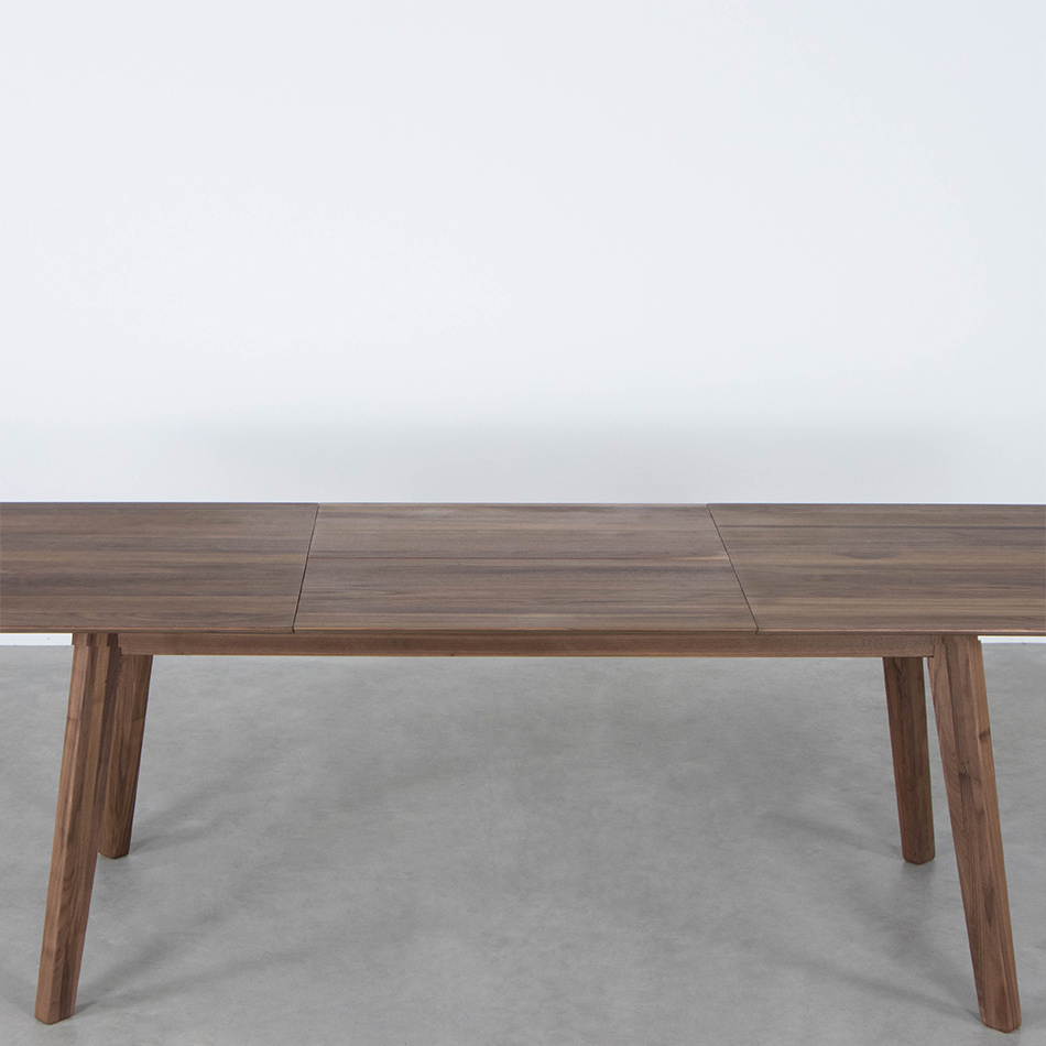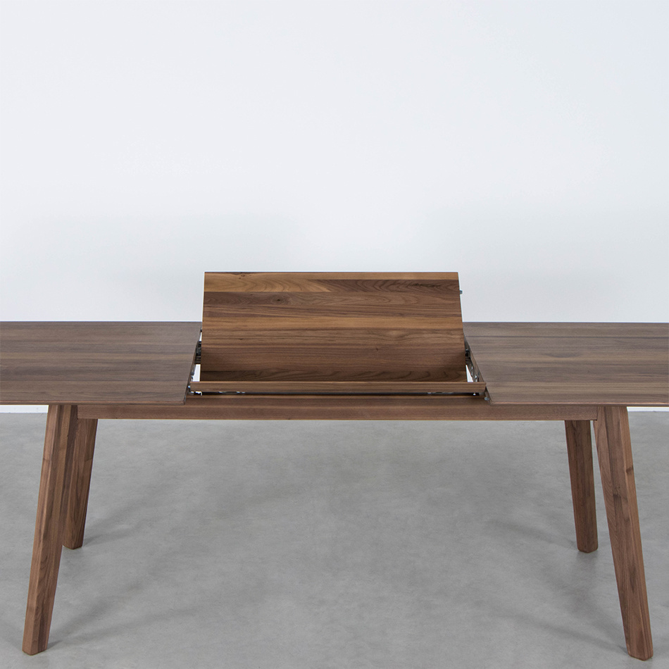 De uitschuifbladen van de tafel hangen onder het tafelblad. Ze hangen hierbij enigszins schuin. Bij een massief houten tafel loopt de lijntekening van het hout niet door bij het uitgeschoven deel van de tafel. Kom eens langs in één van de showrooms om de uitschuifbare tafel te bekijken en de mogelijkheden met ons te bespreken.