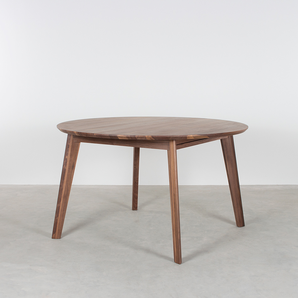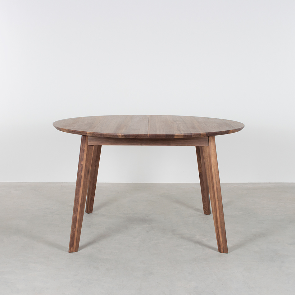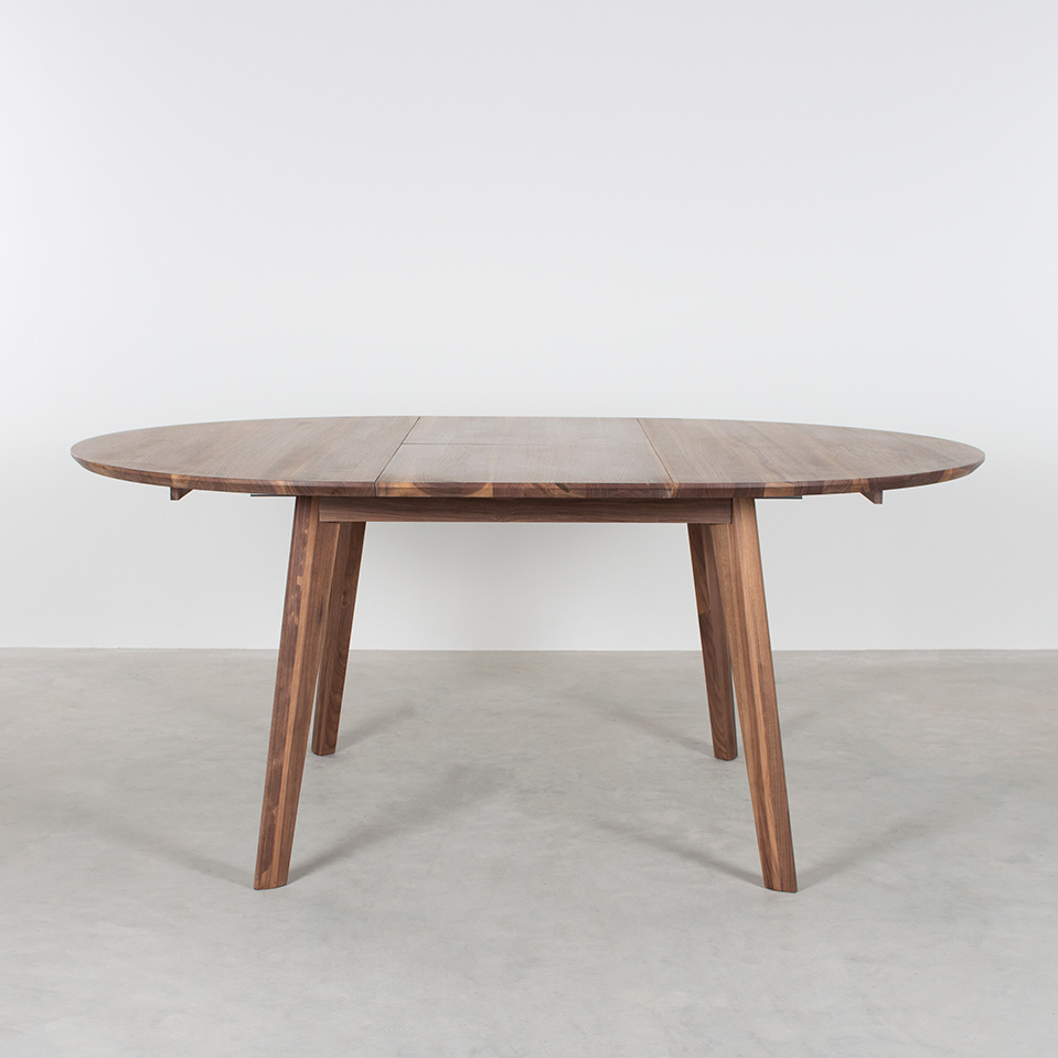 Houten ronde uitschuifbare tafel Nonne biedt het knusse van een ronde tafel en het gemak een rechthoekige tafel. Het blad heeft een verfijnde verjonging aan de onderzijde en een vlak bovenoppervlak, wat de tafel een lichte, speelse uitstraling geeft. Vanuit het midden kan een extra blad van 50 of 60 centimeter worden ingeschoven, waarmee de tafel in een handomdraai geschikt wordt voor 6 tot 8 personen. De vier schuingeplaatste poten met afgeronde hoeken blijven tijdens het uitschuiven stevig op hun plek, wat zorgt voor stabiliteit én een rustige vormgeving.