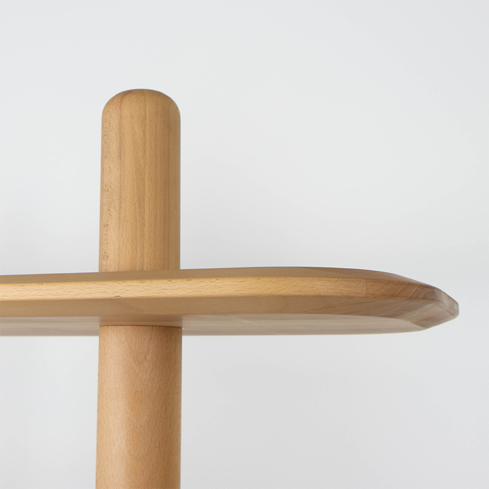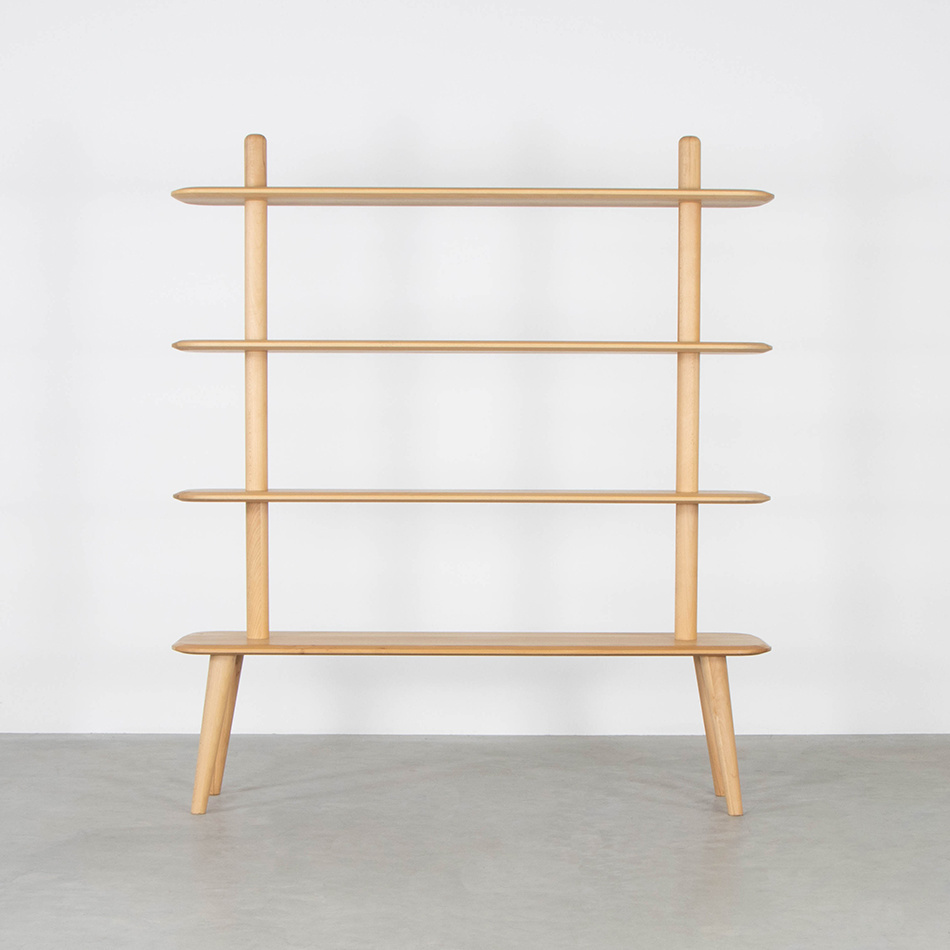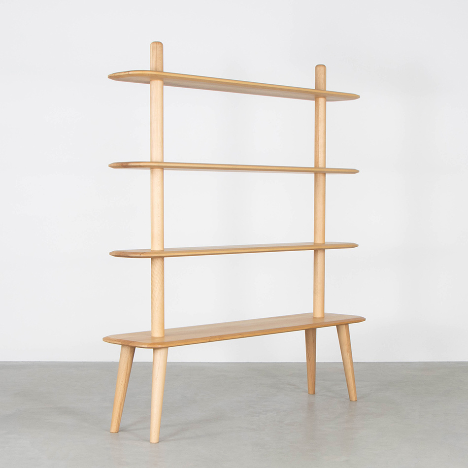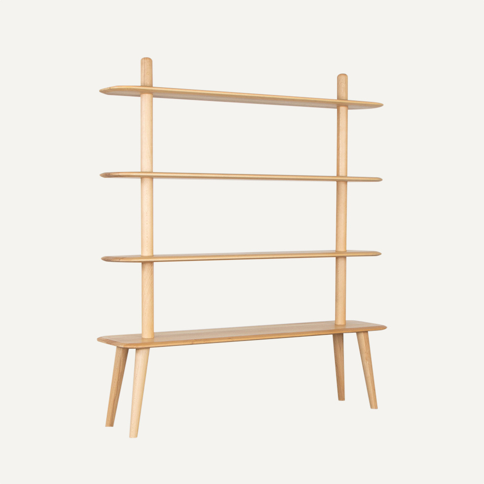 De Olger serie van Sav & Økse is als modern Deens design te omschrijven. Deze open wandkast wordt gekenmerkt door de ranke vorm en bijzondere details. Het meest opvallende detail zijn de poten die doorlopen tot in de planken. De poten steken als het ware door de planken heen en zijn net als de planken mooi vlak afgewerkt. Deze kast is bijzonder om te zien en prachtig uitgevoerd. De poten zijn rond van vorm en zijn schuin geplaatst. Een ander mooi detail is het dunne verjongde blad van de planken, met afgeronde hoeken.