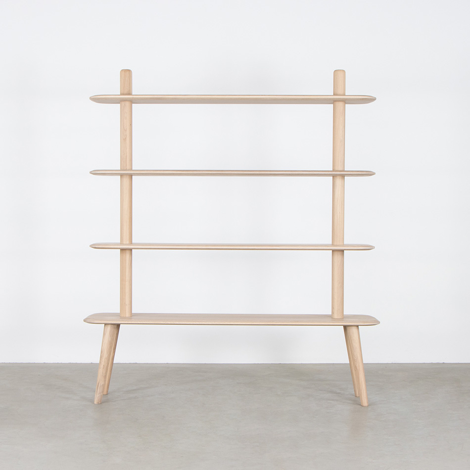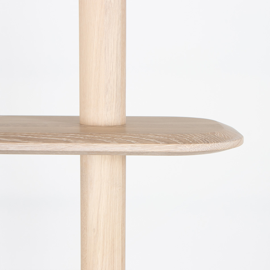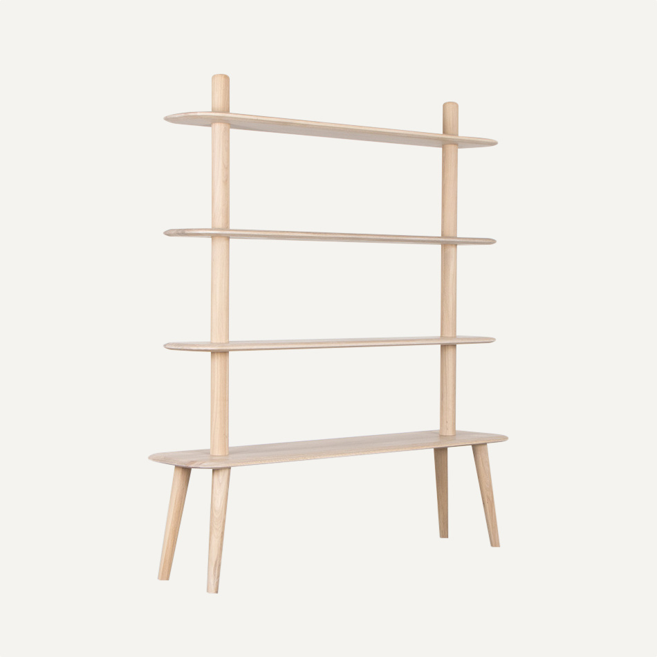 De Olger serie van Sav & Økse is als modern Deens design te omschrijven. Deze open wandkast wordt gekenmerkt door de ranke vorm en bijzondere details. Het meest opvallende detail zijn de poten die doorlopen tot in de planken. De poten steken als het ware door de planken heen en zijn net als de planken mooi vlak afgewerkt. Deze kast is bijzonder om te zien en prachtig uitgevoerd. De poten zijn rond van vorm en zijn schuin geplaatst. Een ander mooi detail is het dunne verjongde blad van de planken, met afgeronde hoeken.