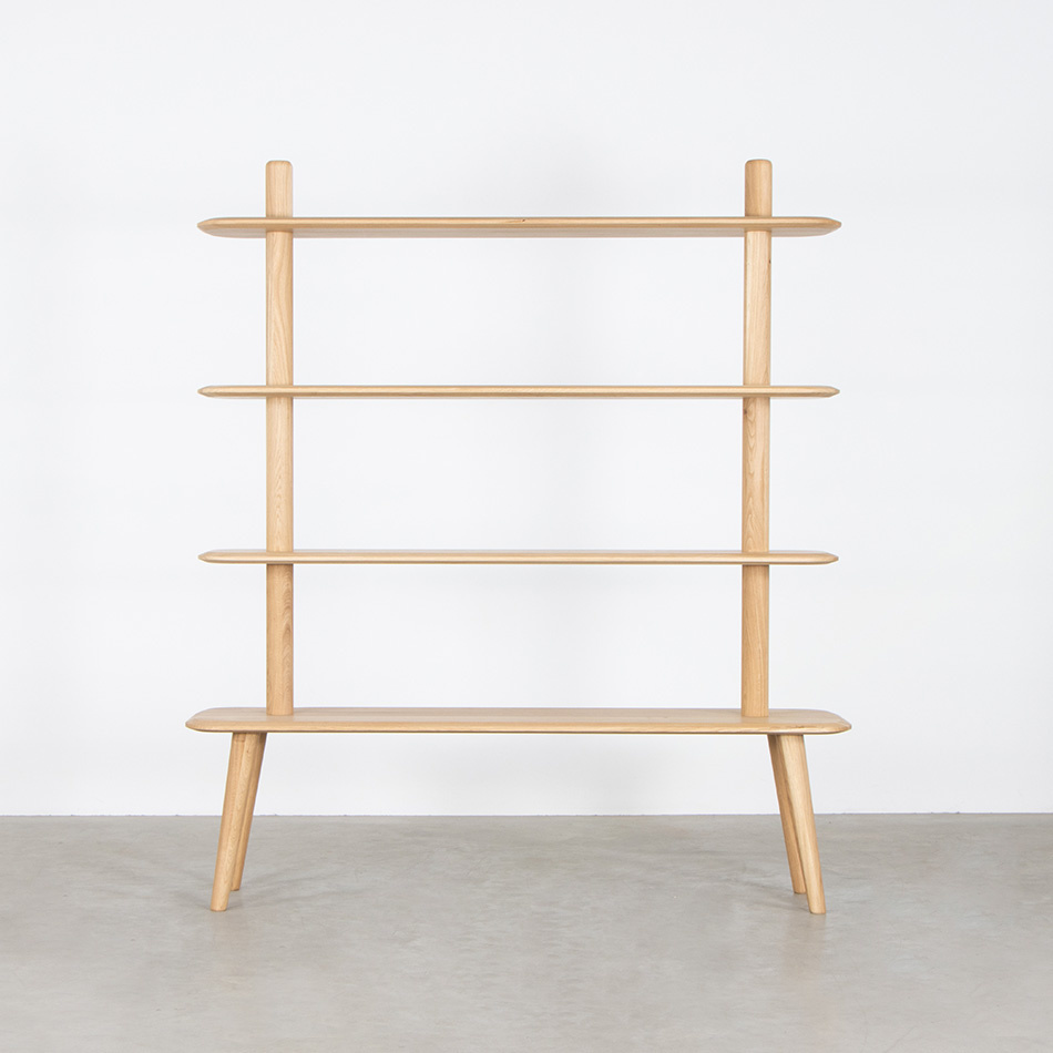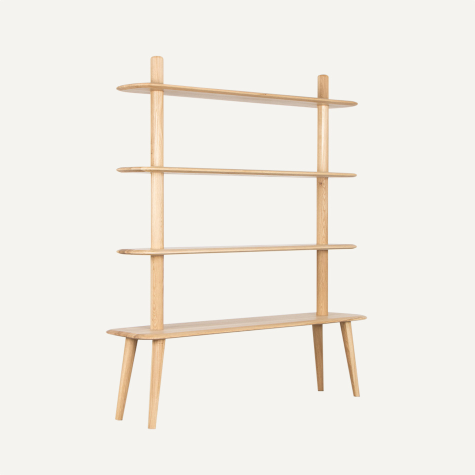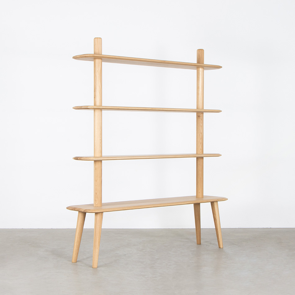 De Olger serie van Sav & Økse is als modern Deens design te omschrijven. Deze open wandkast wordt gekenmerkt door de ranke vorm en bijzondere details. Het meest opvallende detail zijn de poten die doorlopen tot in de planken. De poten steken als het ware door de planken heen en zijn net als de planken mooi vlak afgewerkt. Deze kast is bijzonder om te zien en prachtig uitgevoerd. De poten zijn rond van vorm en zijn schuin geplaatst. Een ander mooi detail is het dunne verjongde blad van de planken, met afgeronde hoeken.